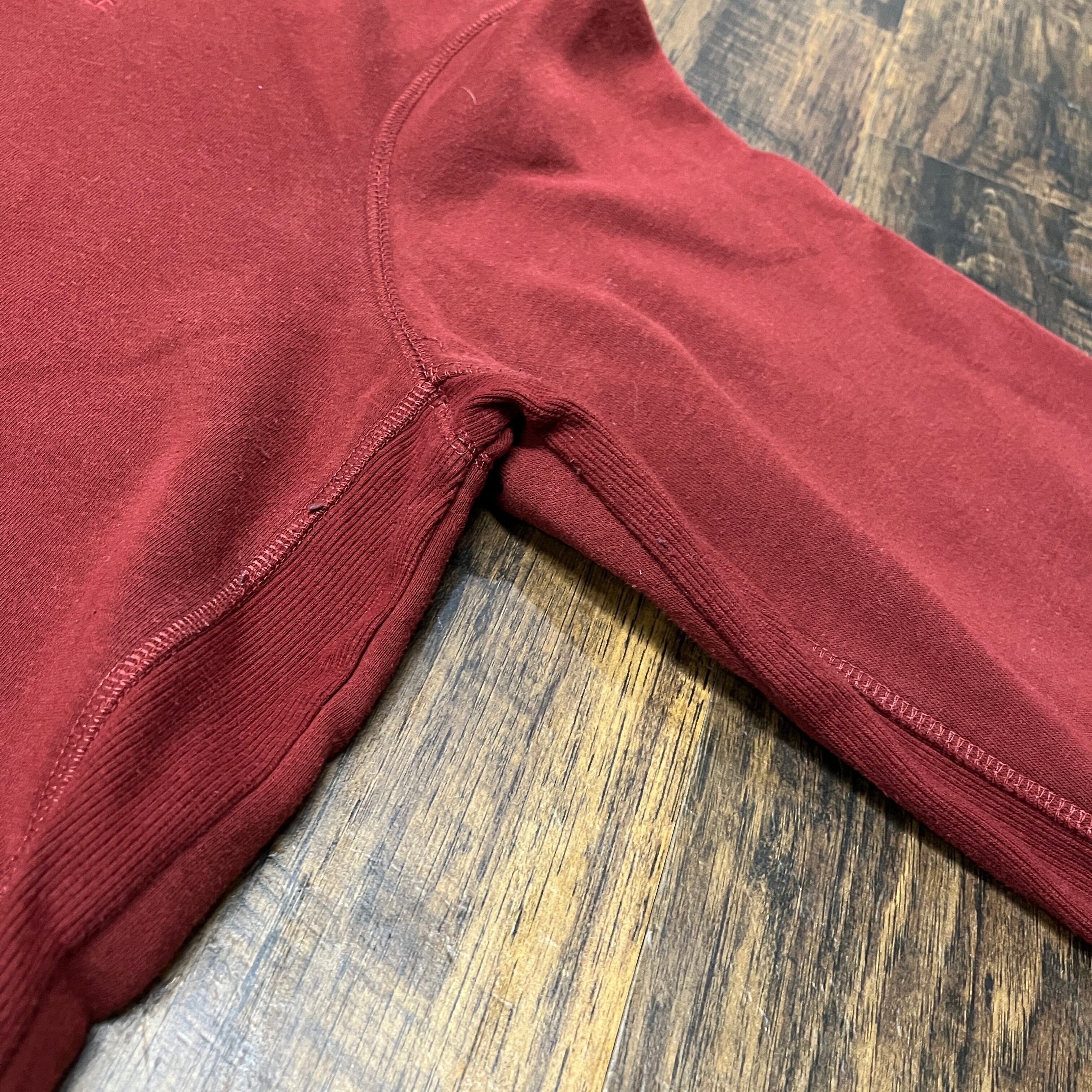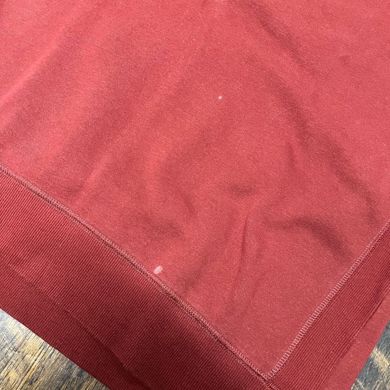 シンプルな赤のクルーネックトレーナー、刺繍ロゴ付き。