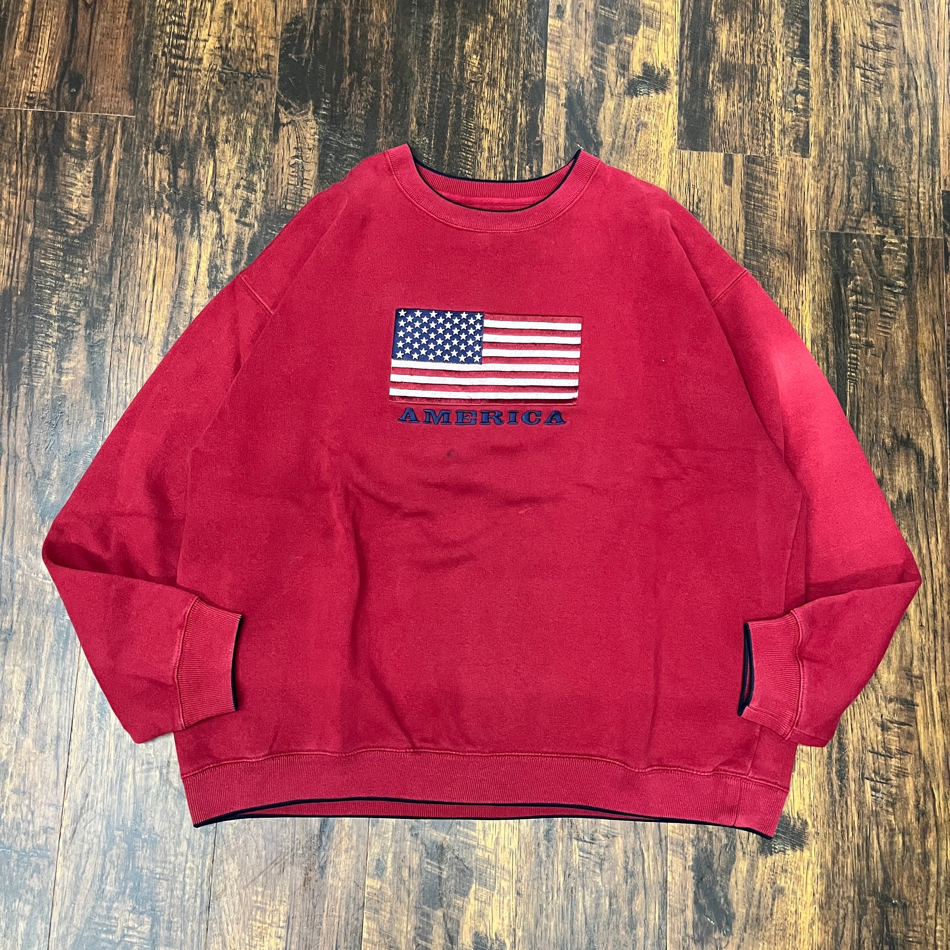アメリカ国旗のプリントが特徴的な赤いクルーネックトレーナー。