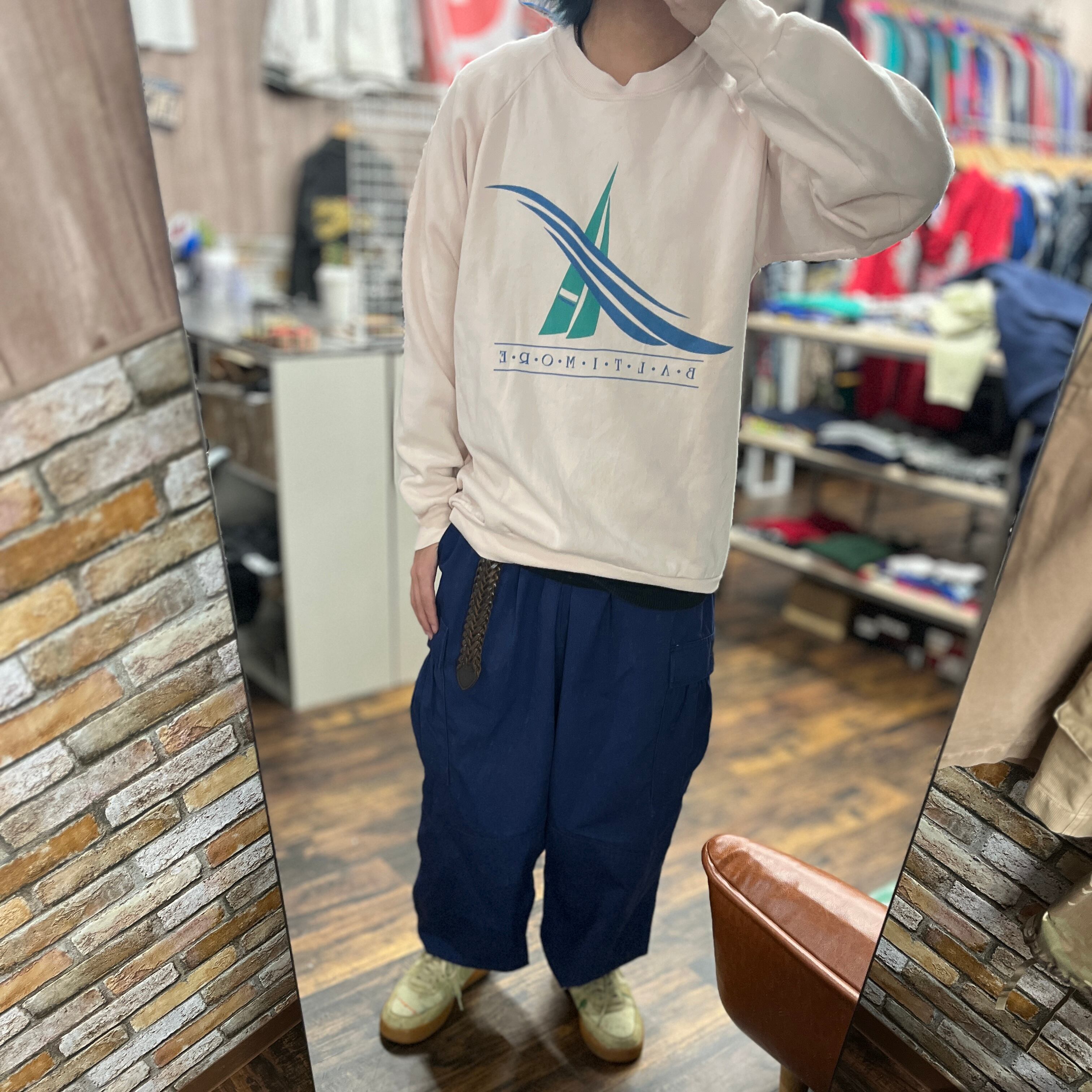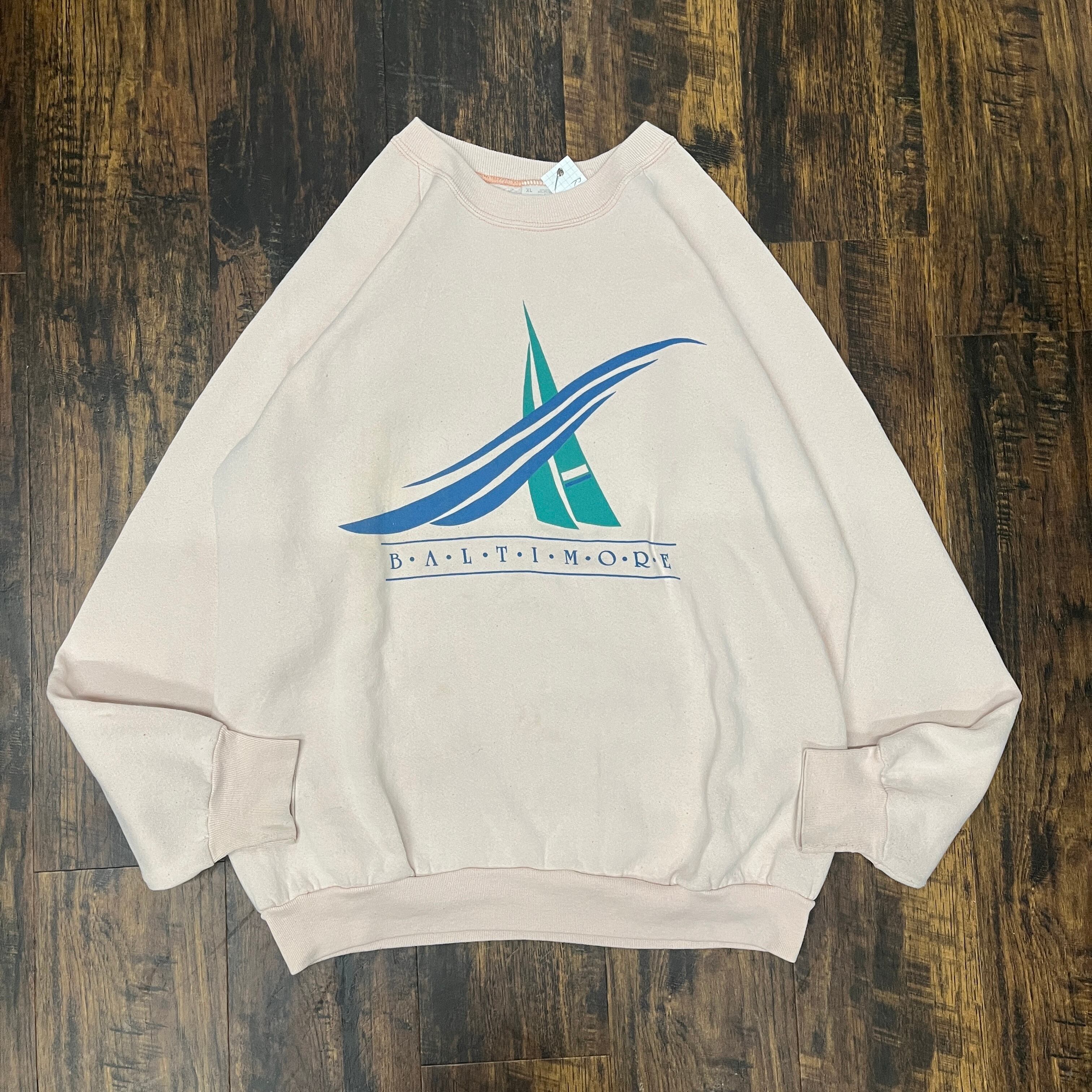 ボートと波のグラフィックが特徴のライトピンクのオーバーサイズスウェット。