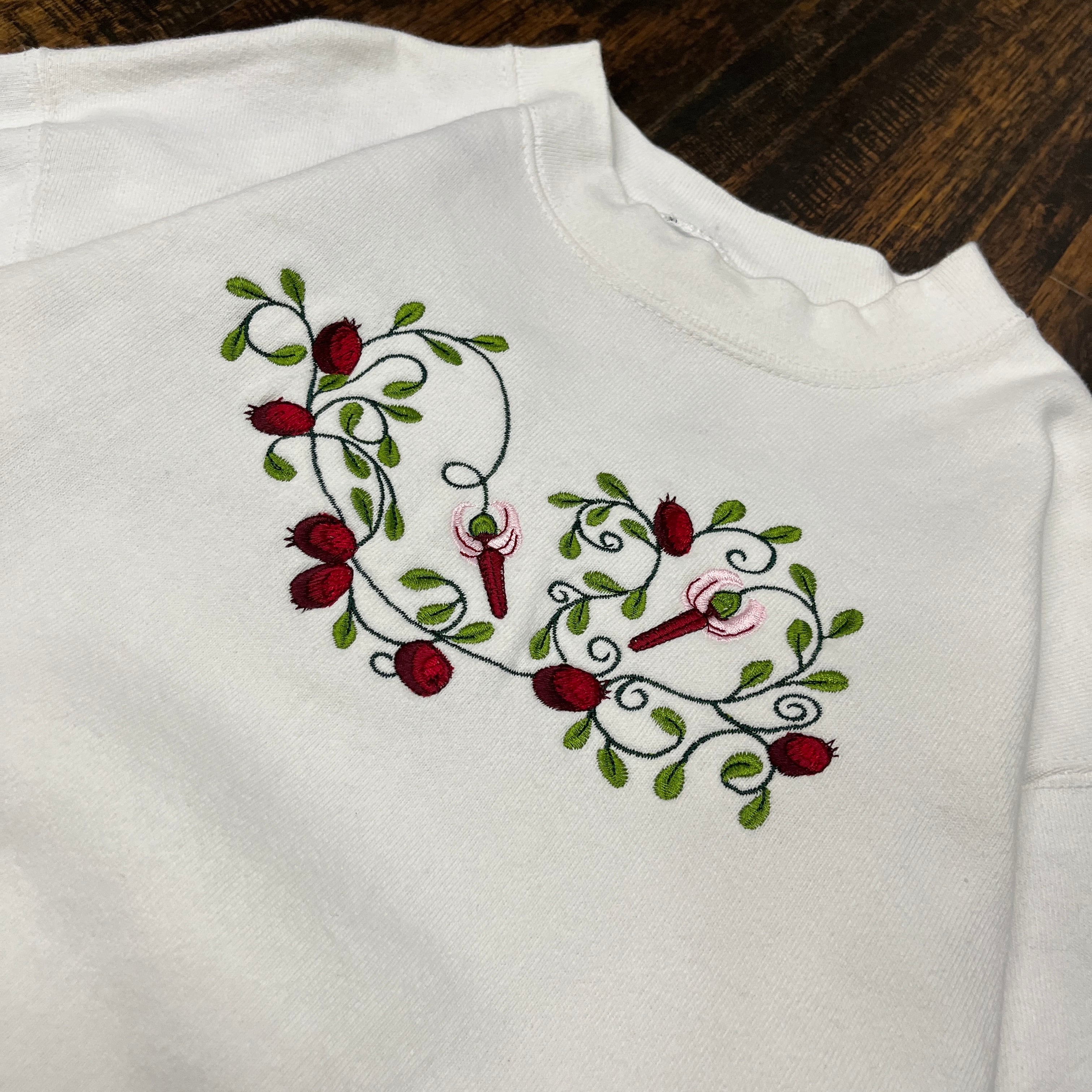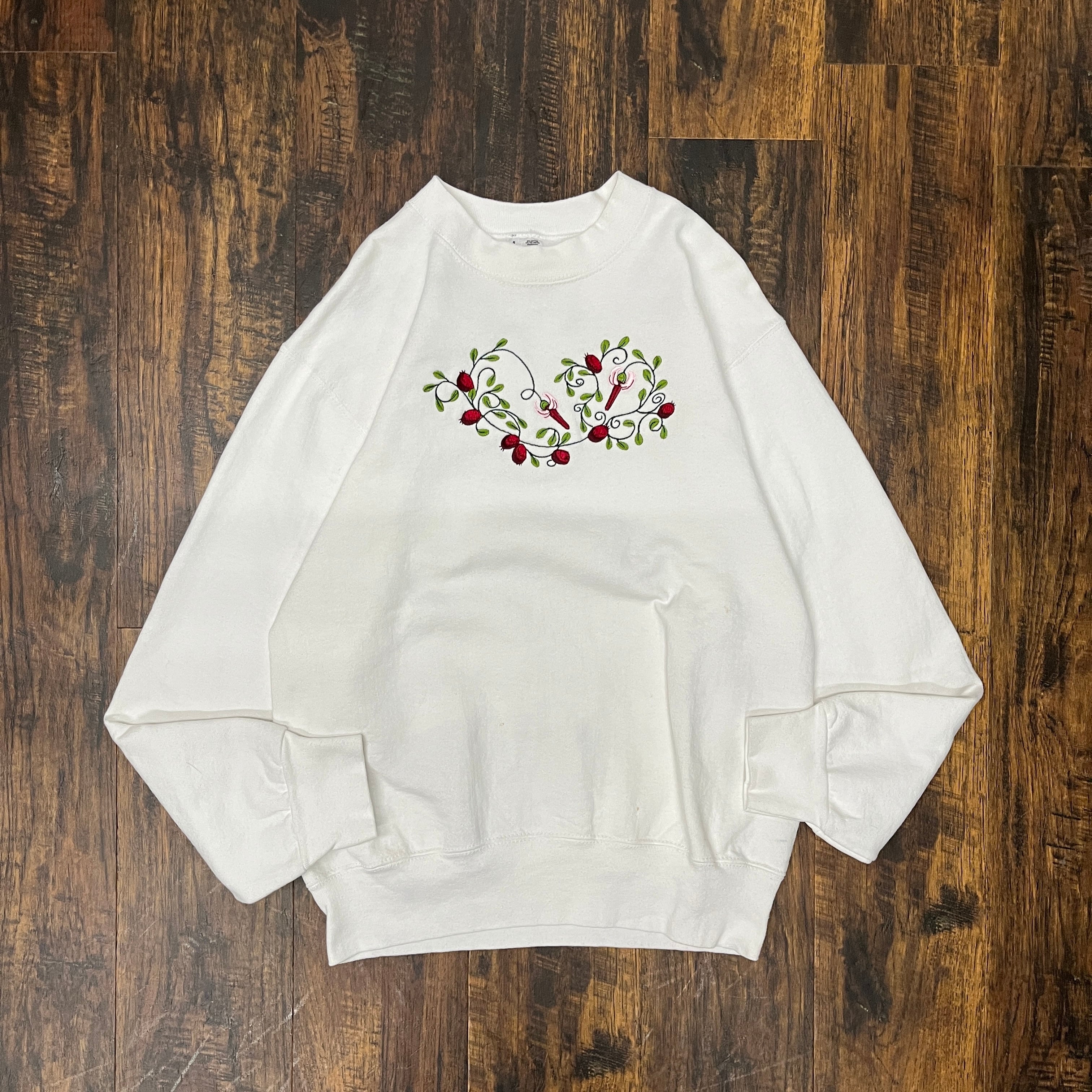 ホワイトのコットン混紡トレーナー、花と葉の刺繍デザイン。