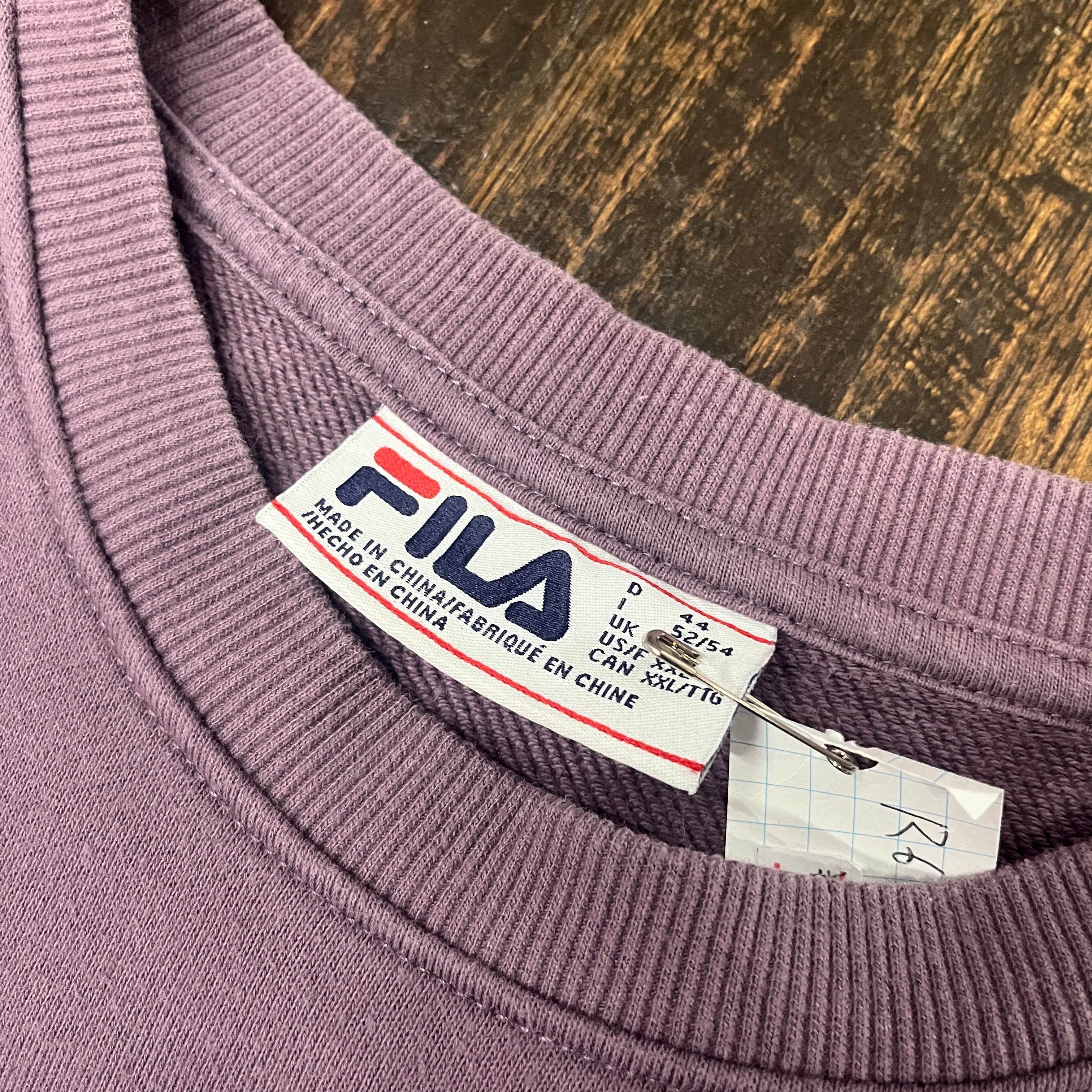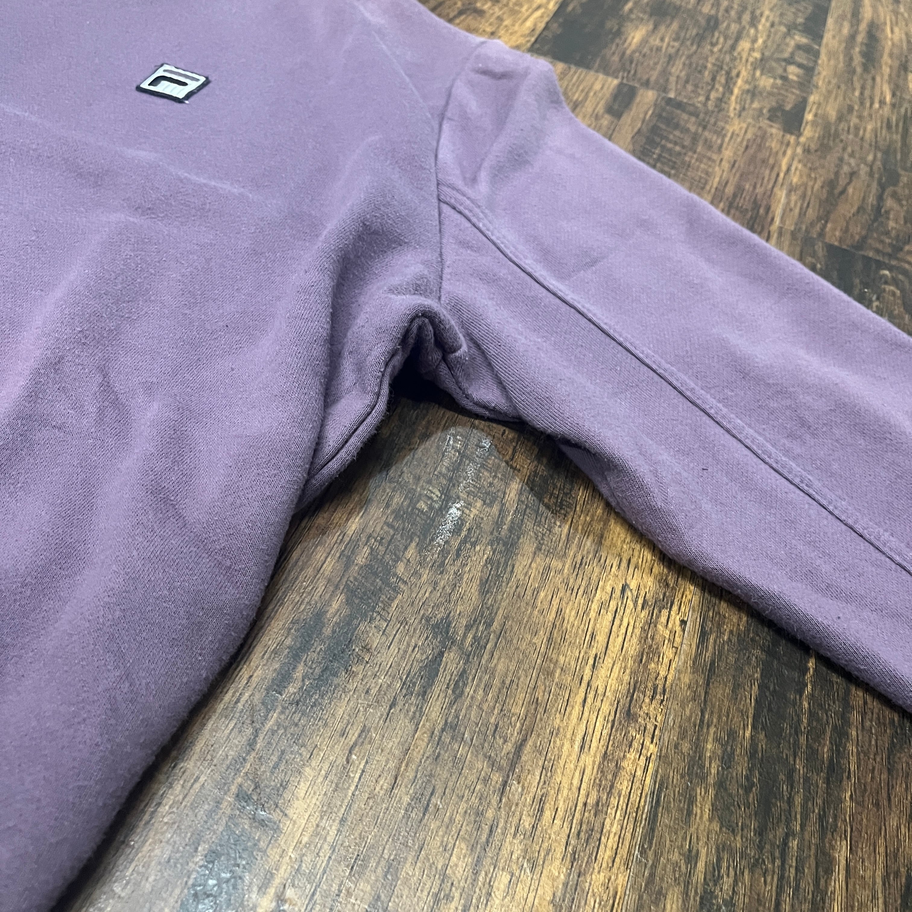 FILAのパープル長袖トレーナー、エンブレム付きでリブ裾デザイン。