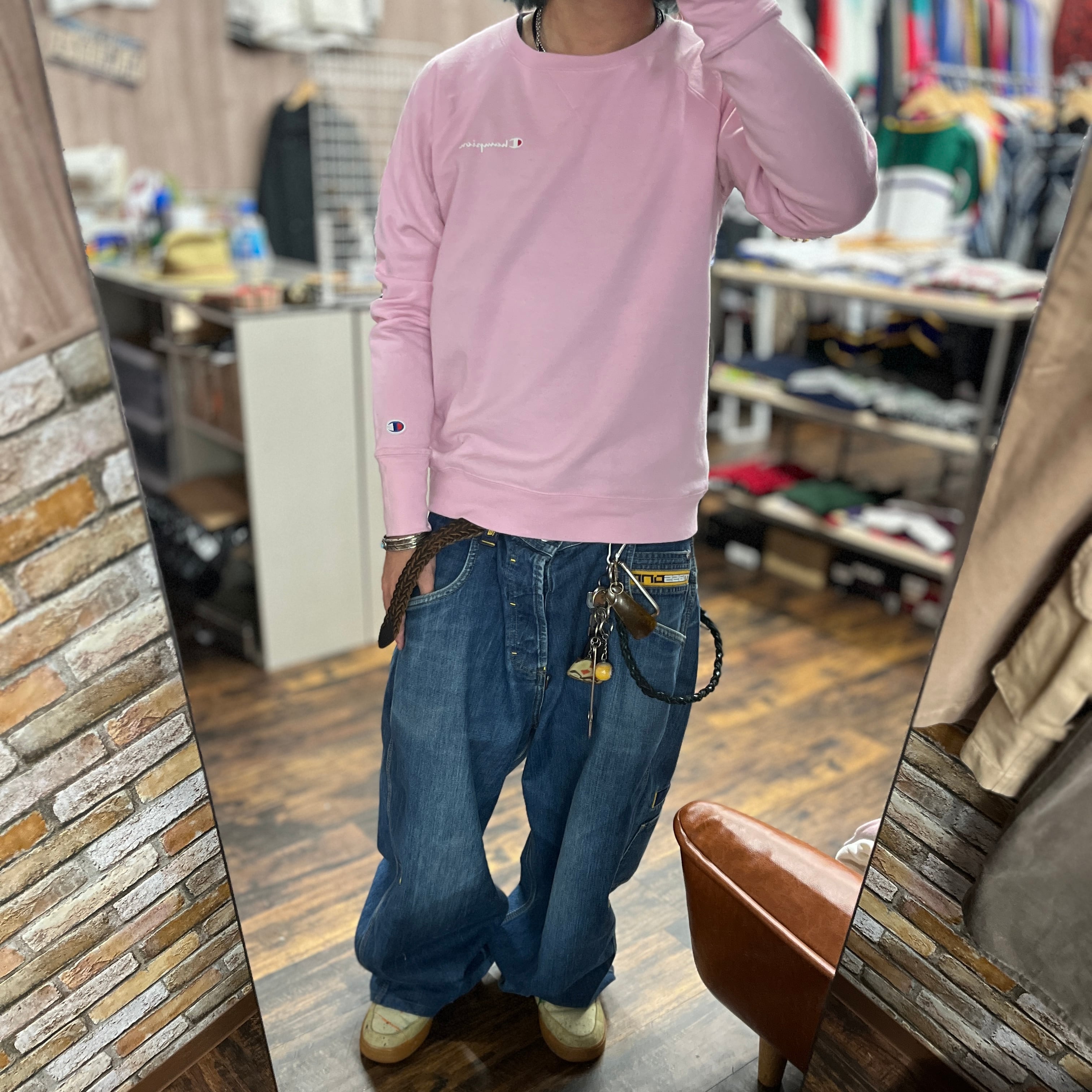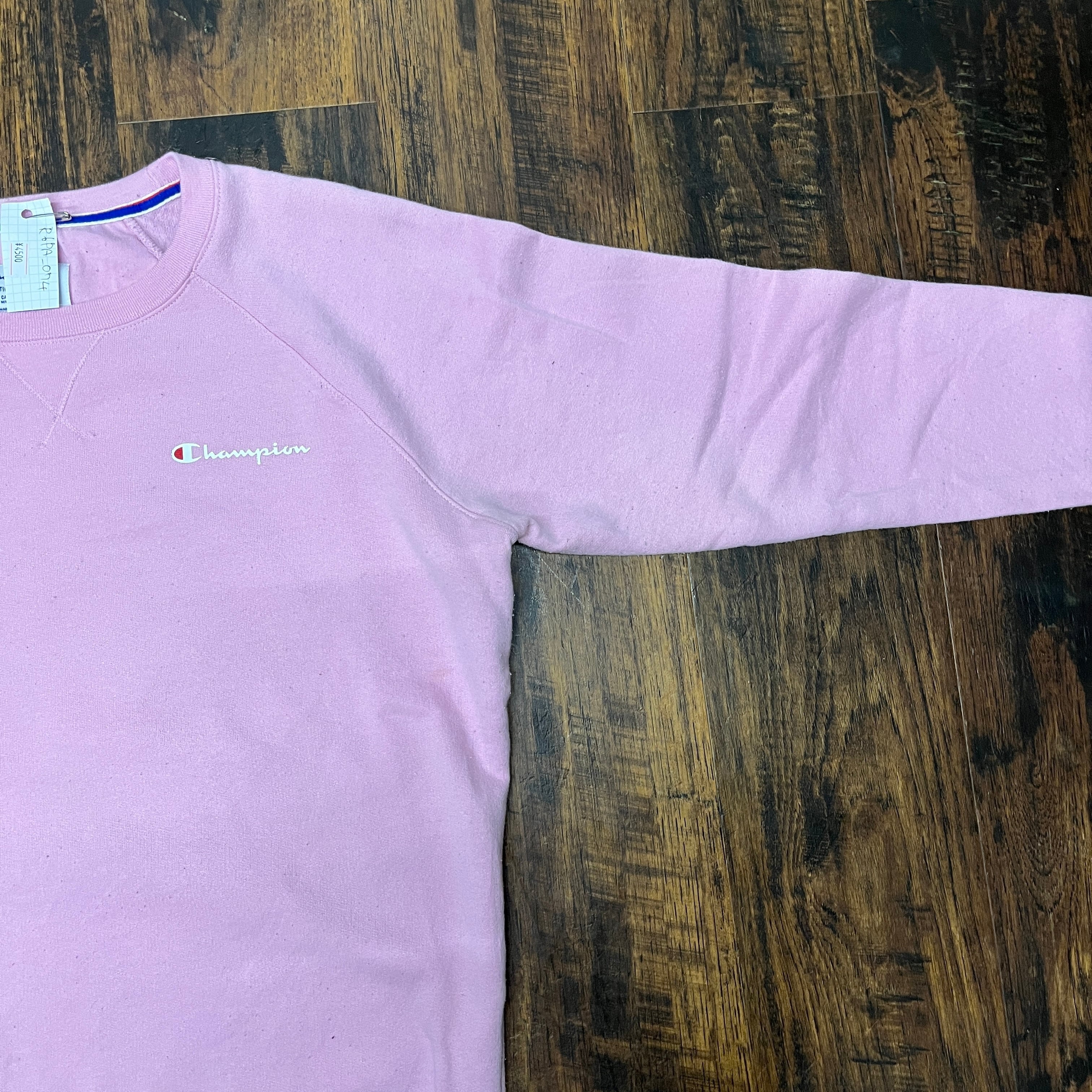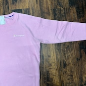 ピンクのChampionトレーナー、ロゴ刺繍入り、ラグランスリーブデザイン。