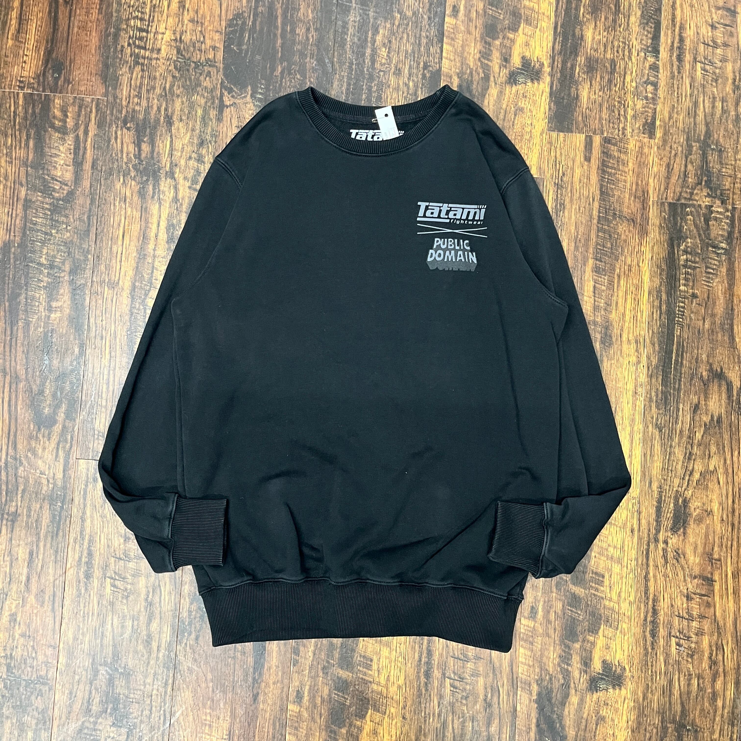 Tatamiのブラックスウェット、PUBLIC DOMAINプリント入り。