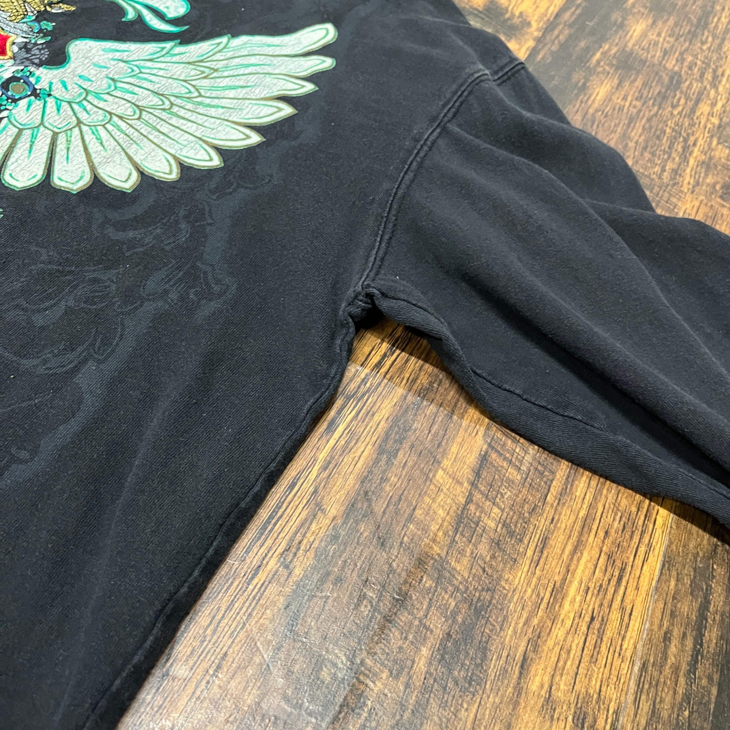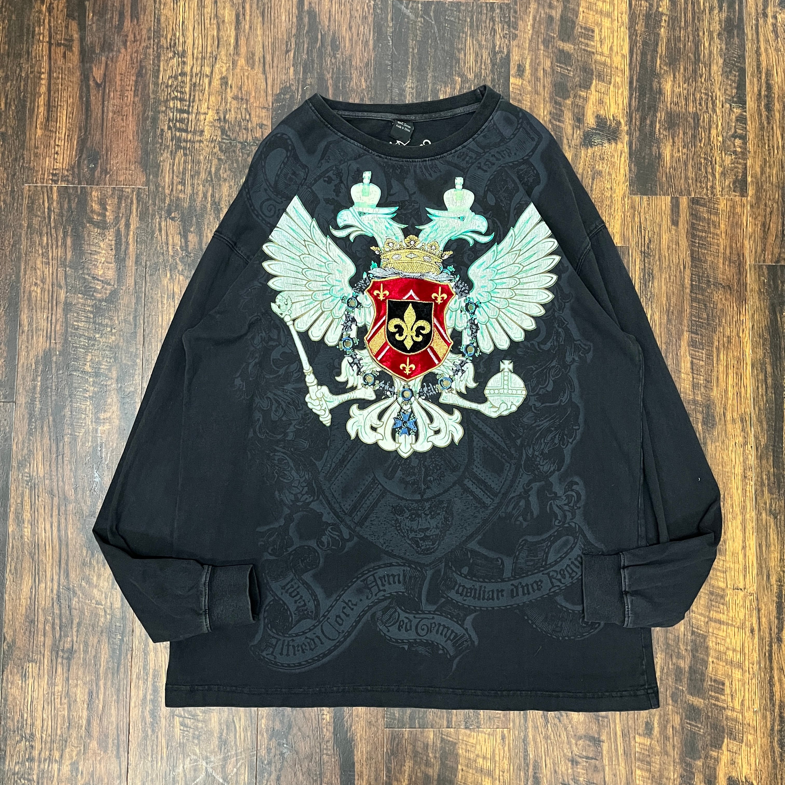 エンブレムデザインの長袖カットソー、刺繍装飾が特徴。