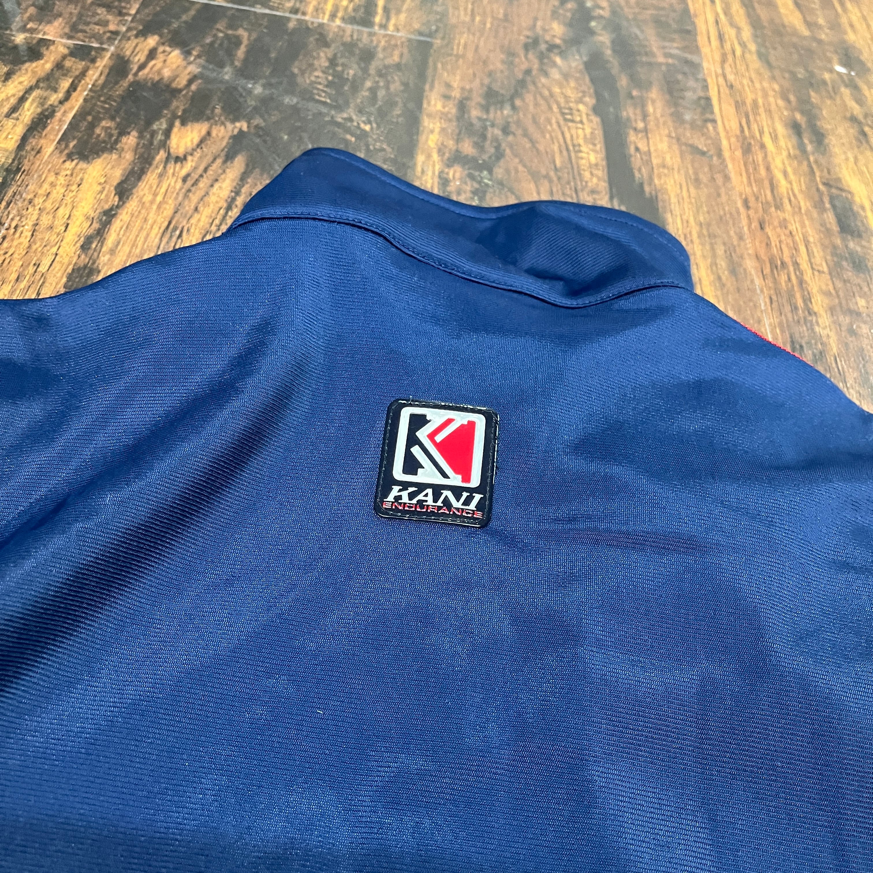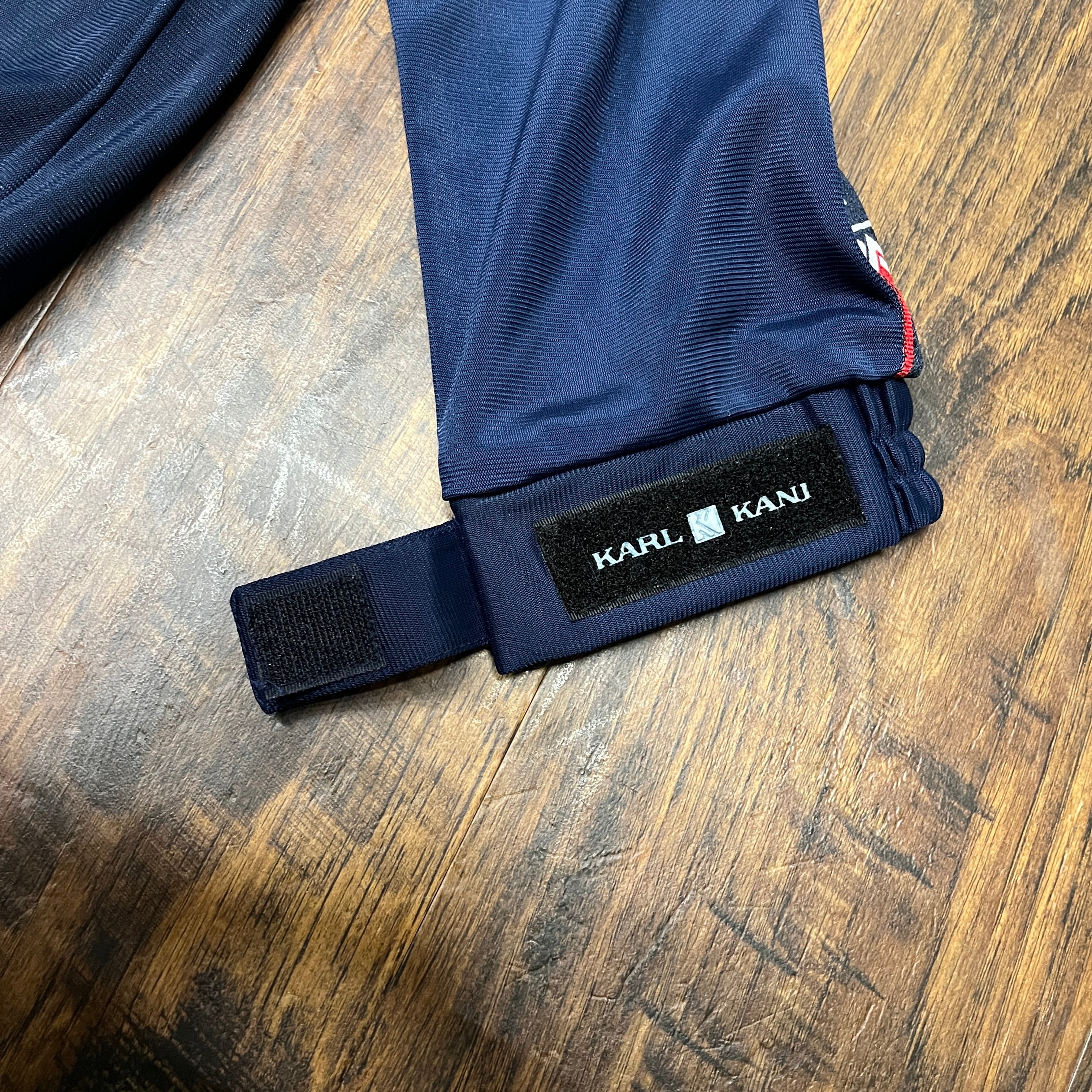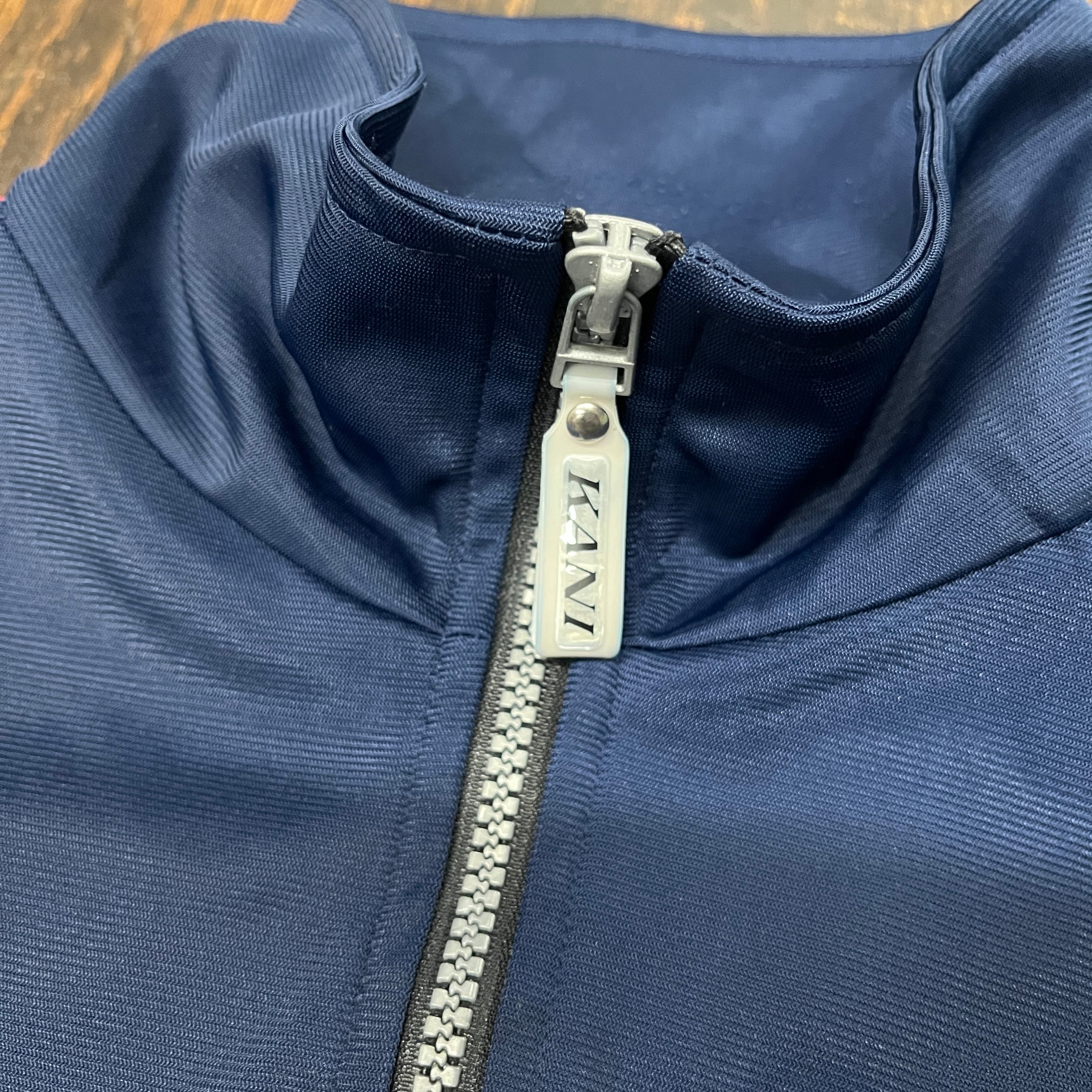 ネイビーのジップアップジャケット、刺繍ロゴ付きでサイドポケットあり。