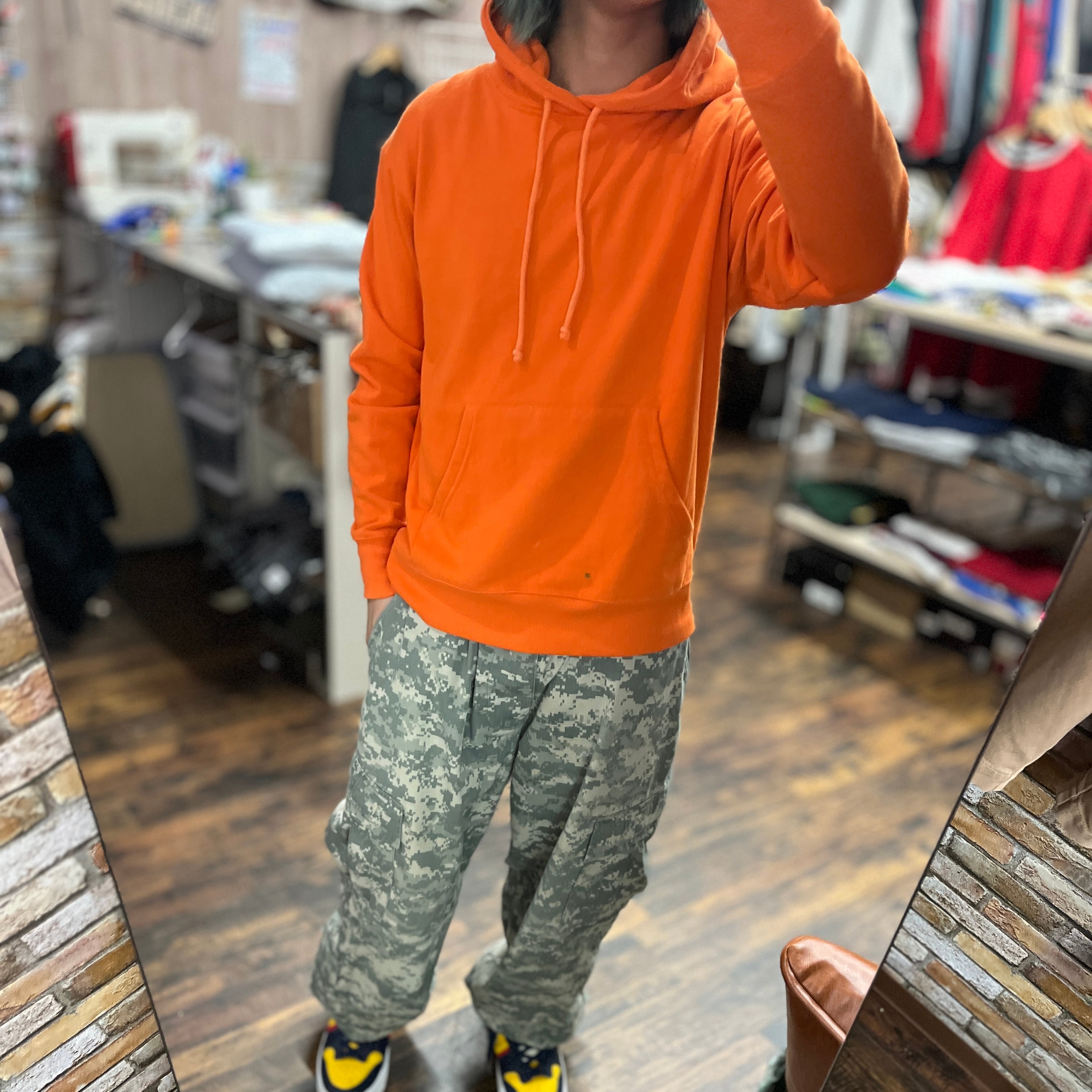 オレンジのフード付きパーカー、ポケット付きでカジュアルなスタイルに最適。