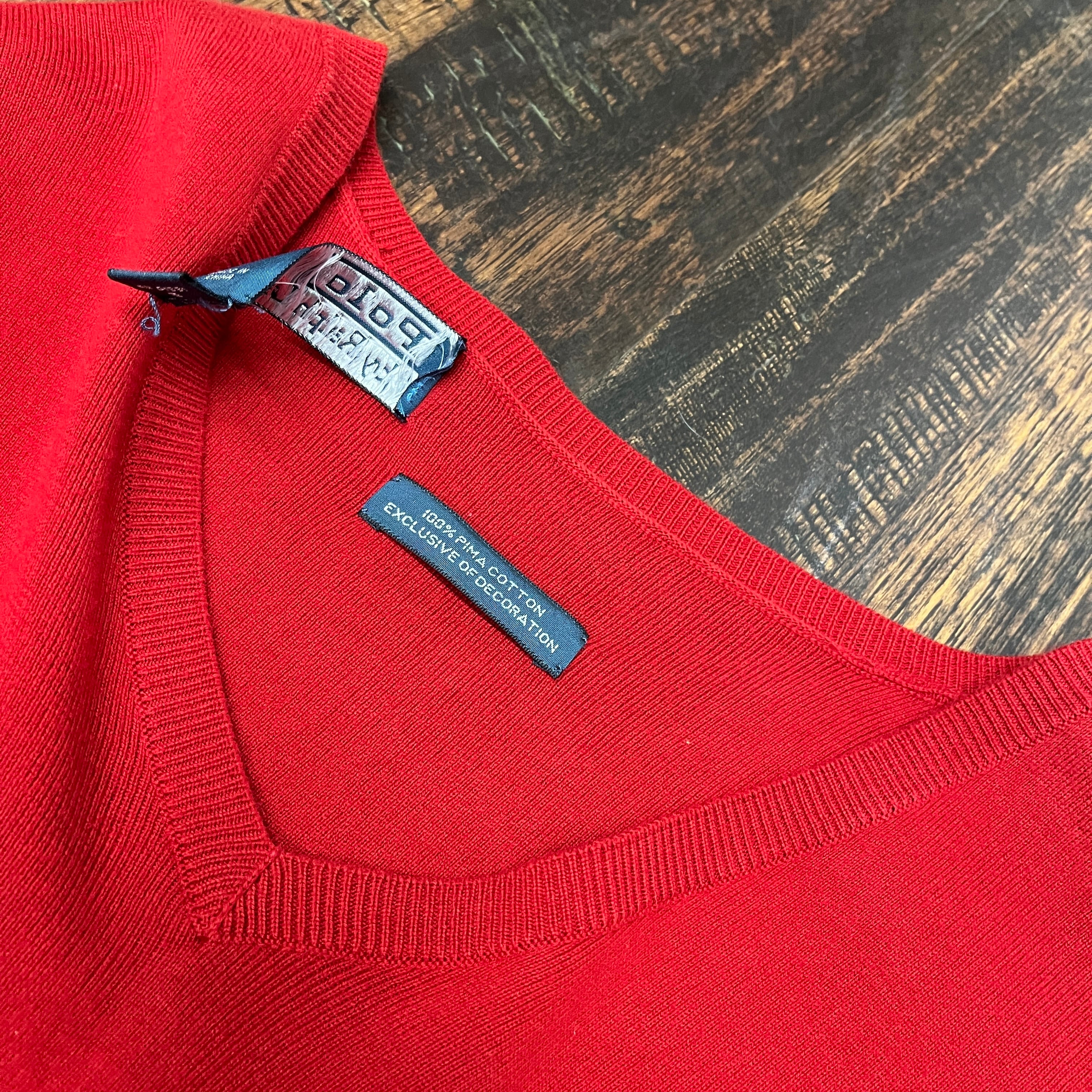 ポロの刺繍が施されたレッドのVネックノースリーブニット。