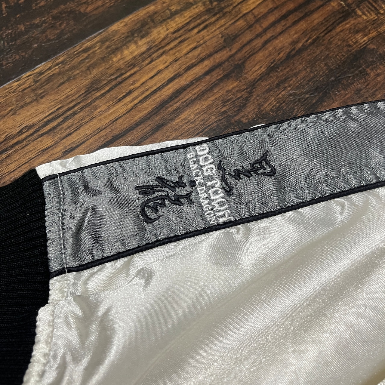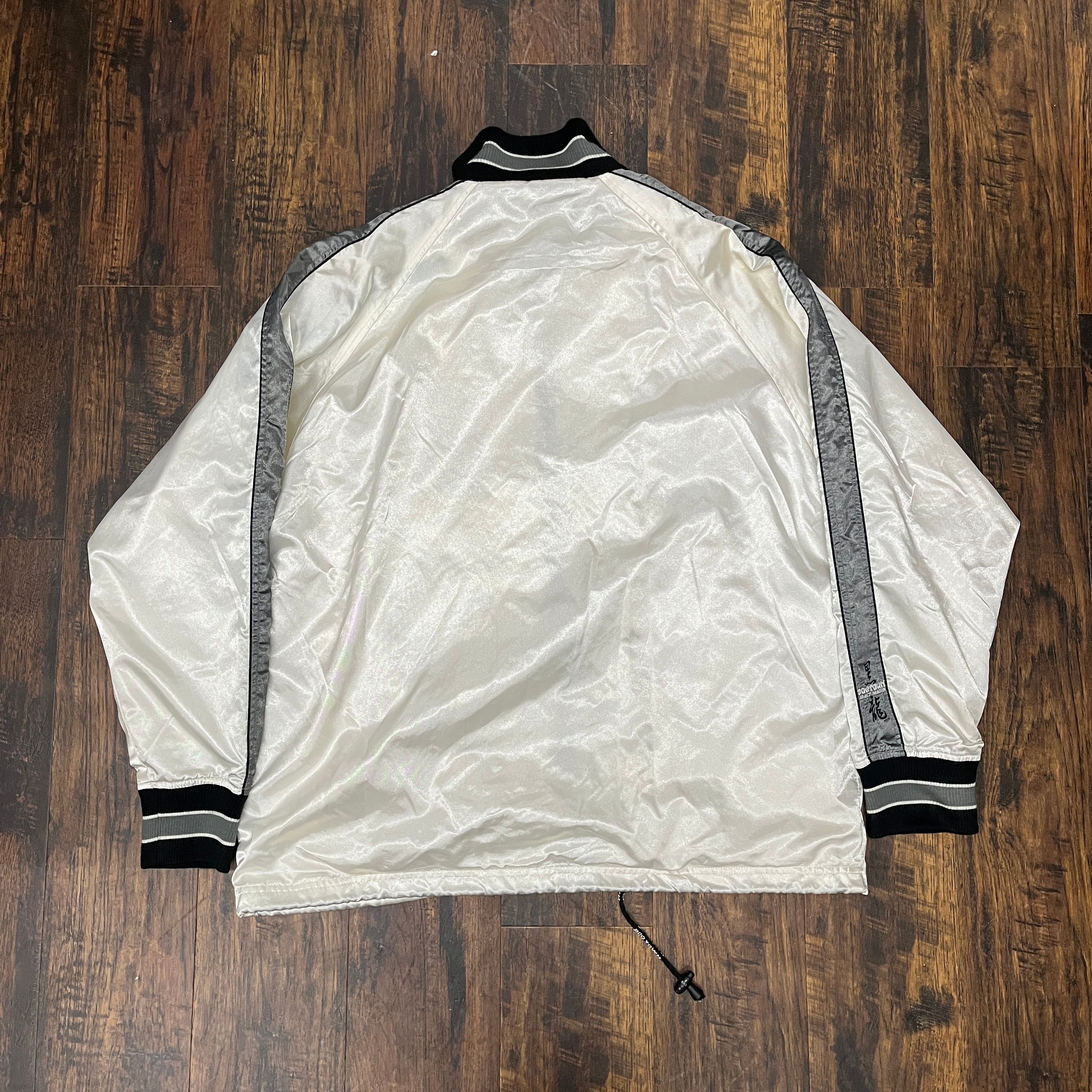 シルバーのナイロンジャケット、刺繍ロゴ付きでスタイリッシュ。