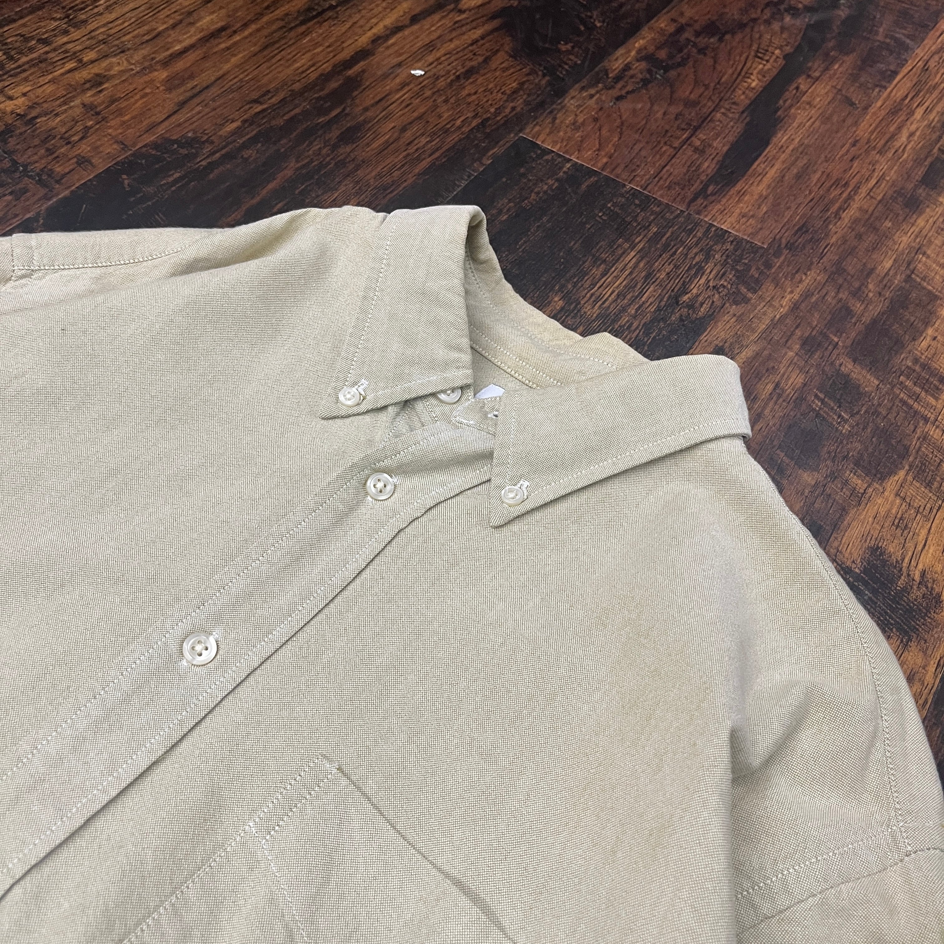 薄いベージュのボタンダウンシャツ、胸ポケット付きでカジュアルに最適。