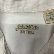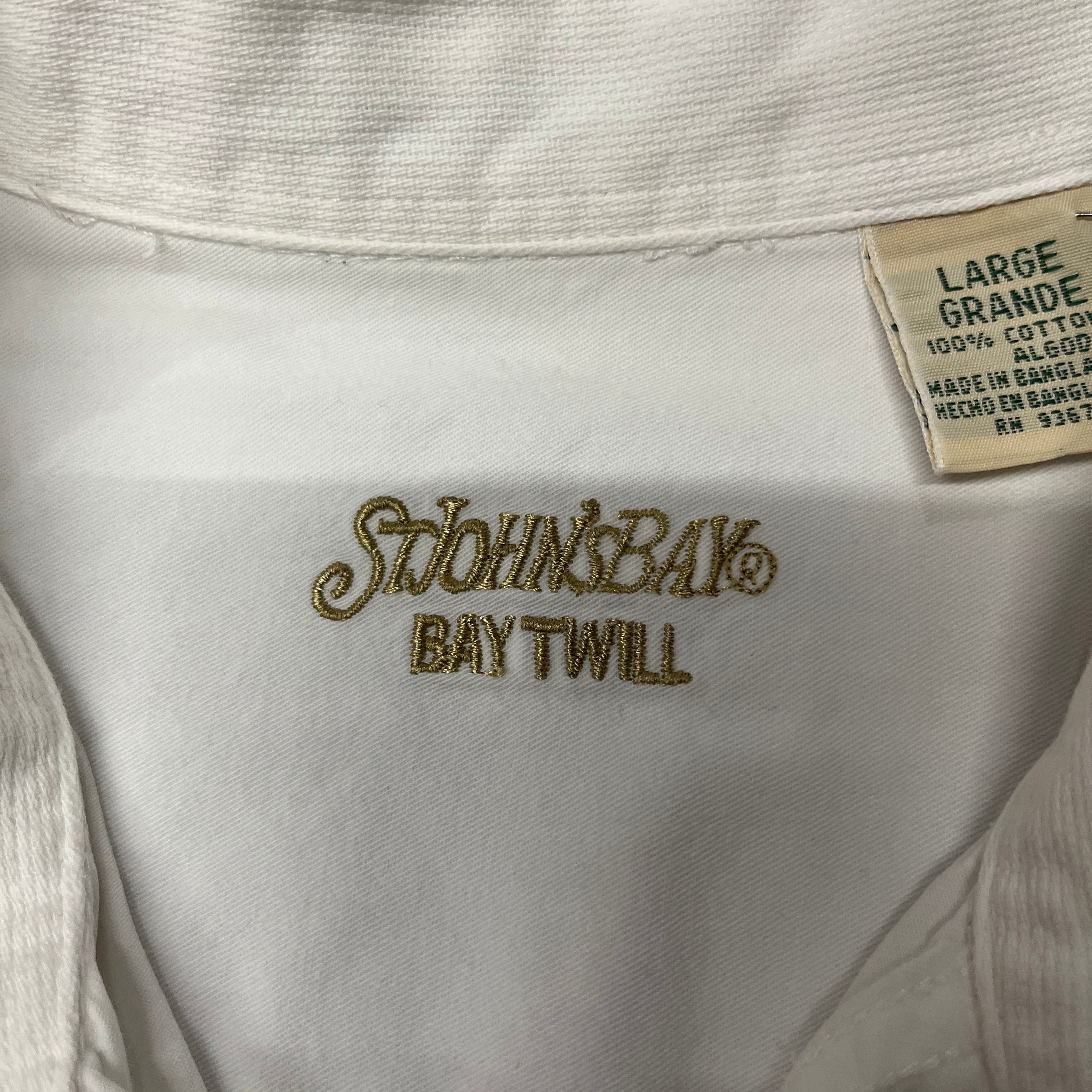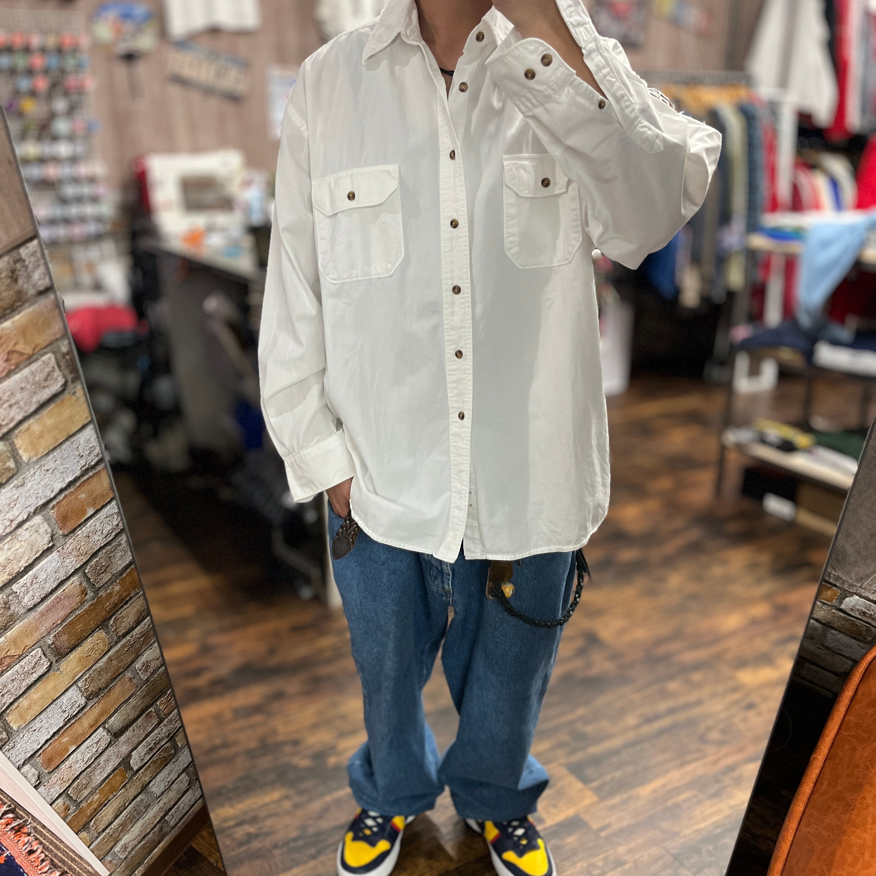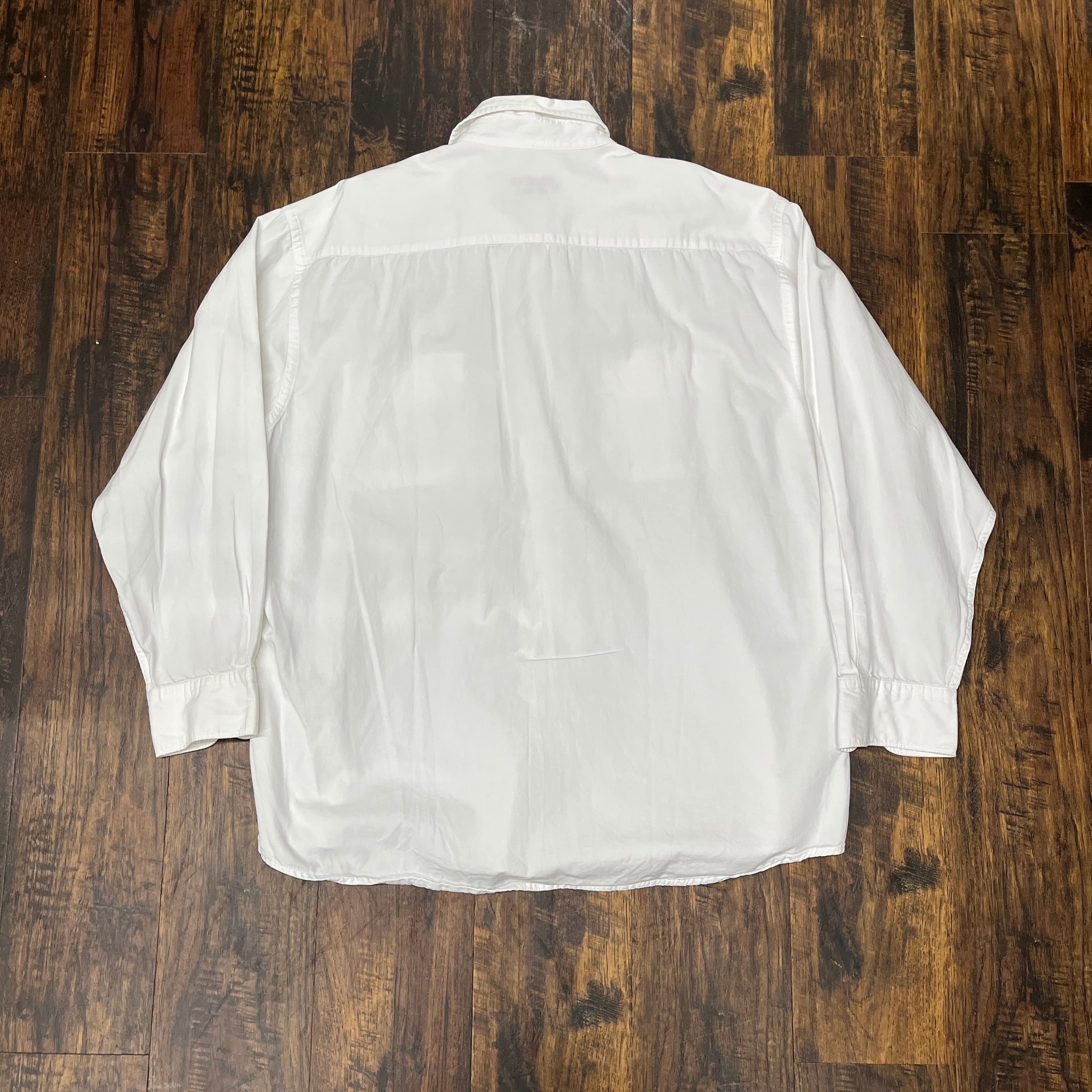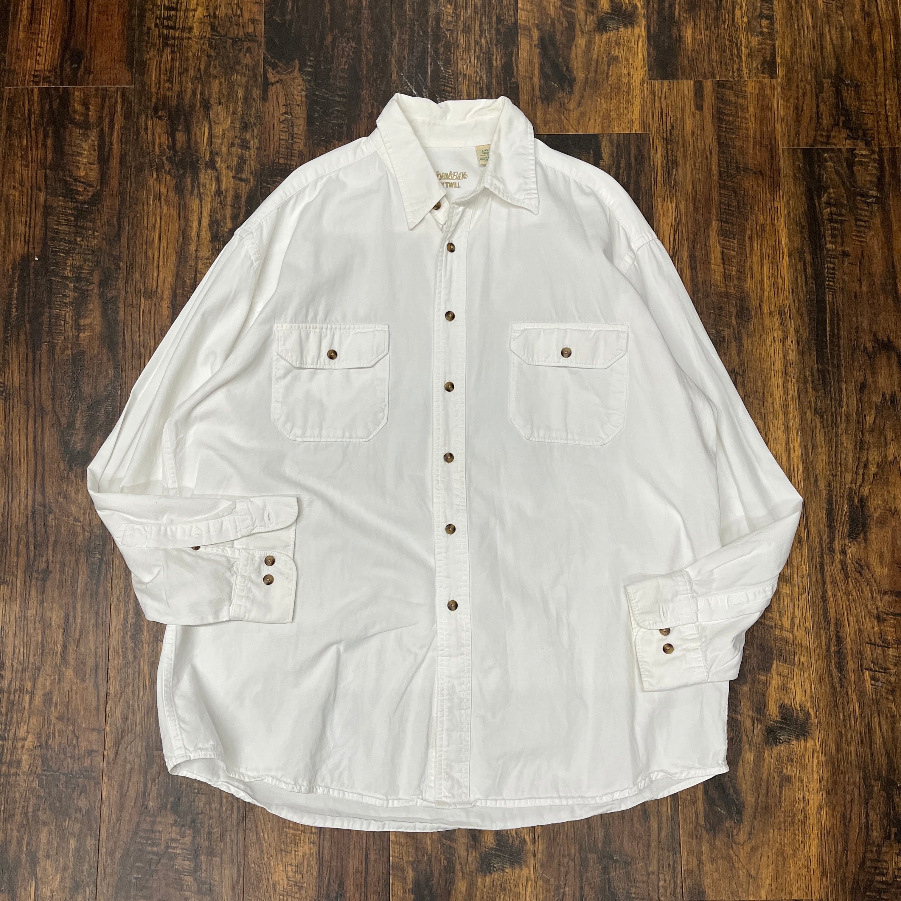 ホワイトのカジュアルなコットンシャツ、ボタン付きポケット付き。