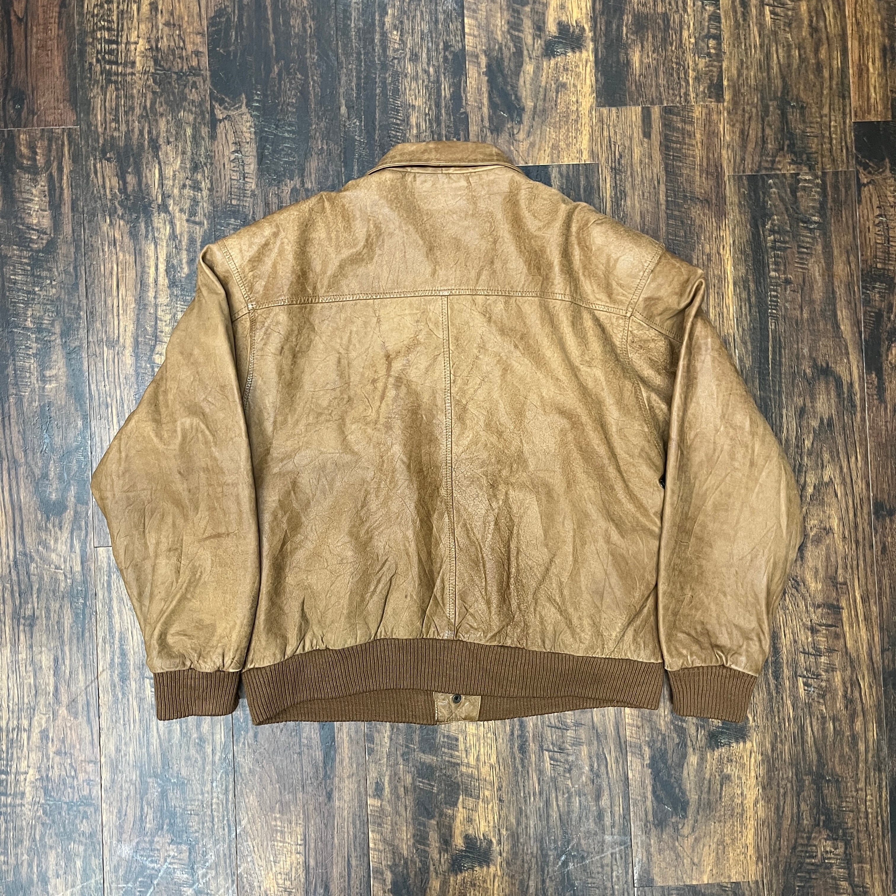 ブラウンレザーのボンバージャケット、リブ付き袖とカラフルなライニングが特徴。