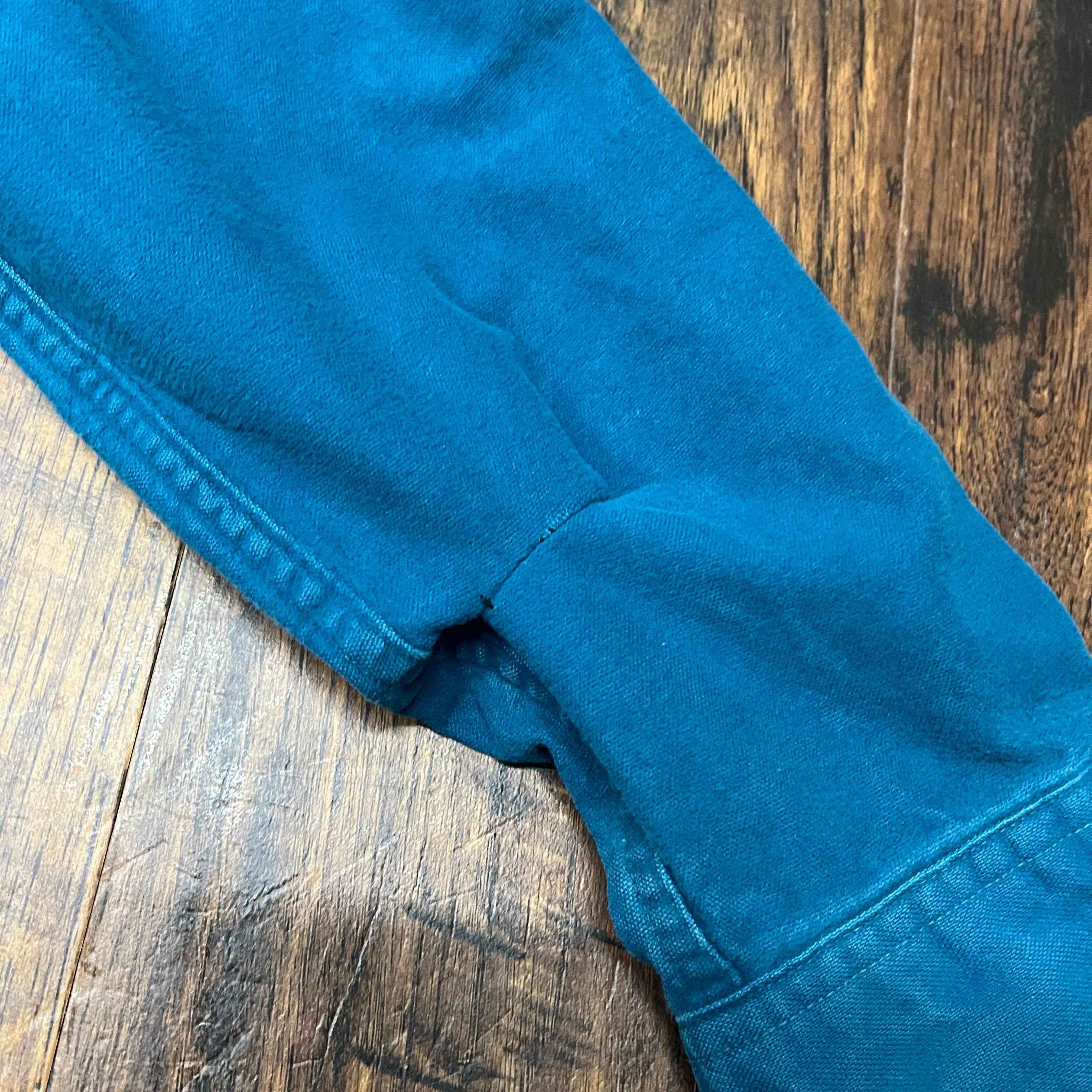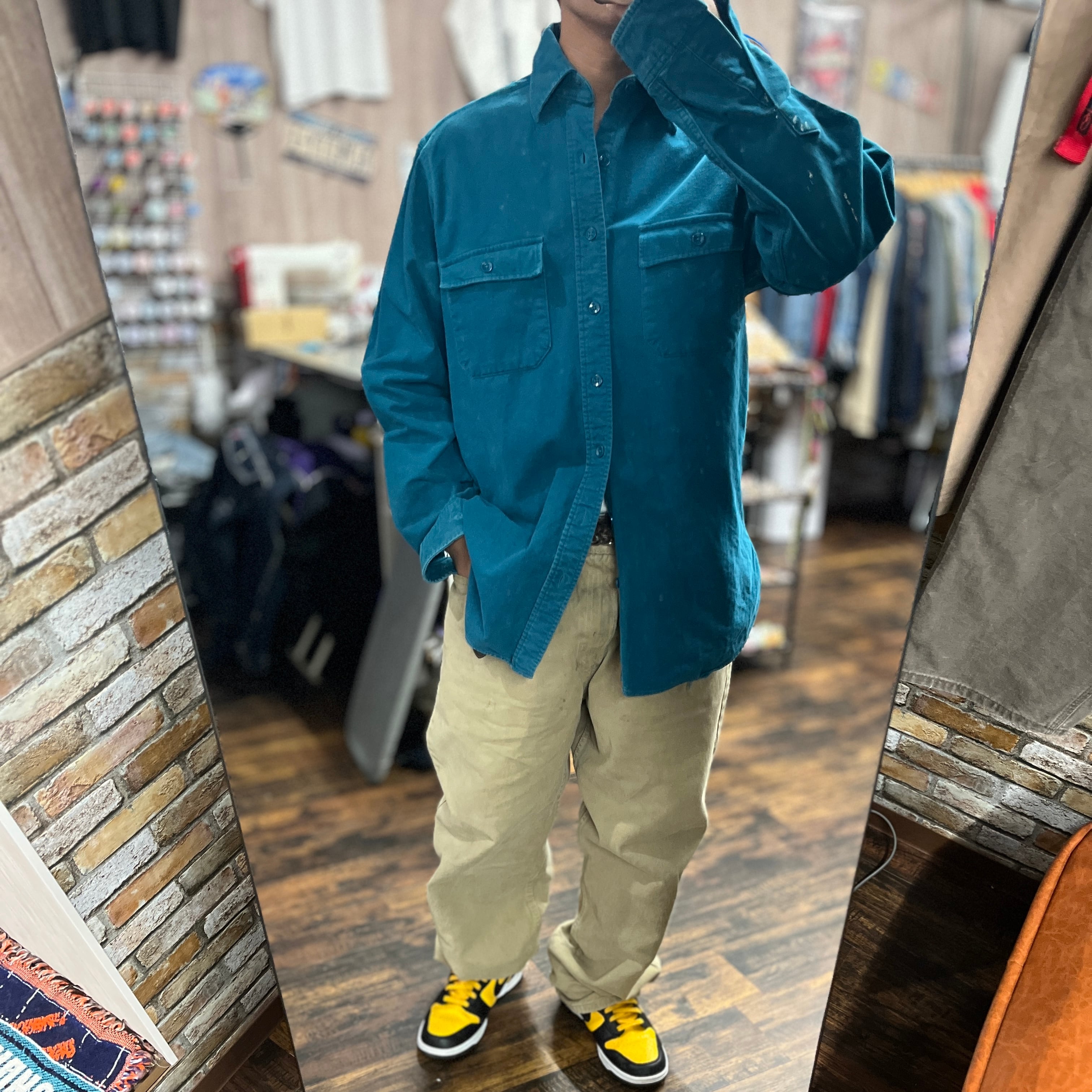 コットン素材の青い長袖シャツ、ボタンアップデザイン、ポケット付き。