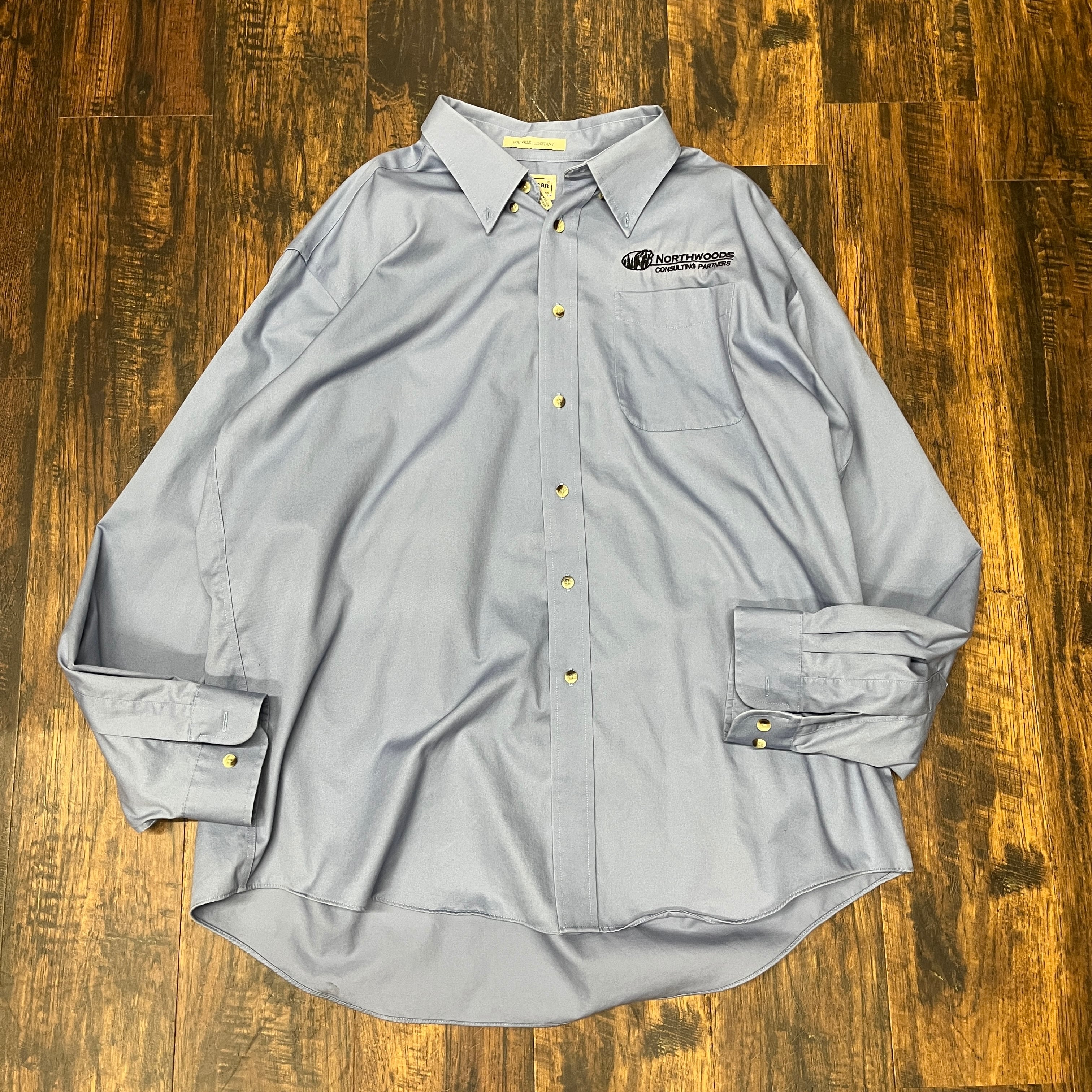 ライトブルーのポリエステル混紡の長袖シャツ、刺繍ロゴ付き。