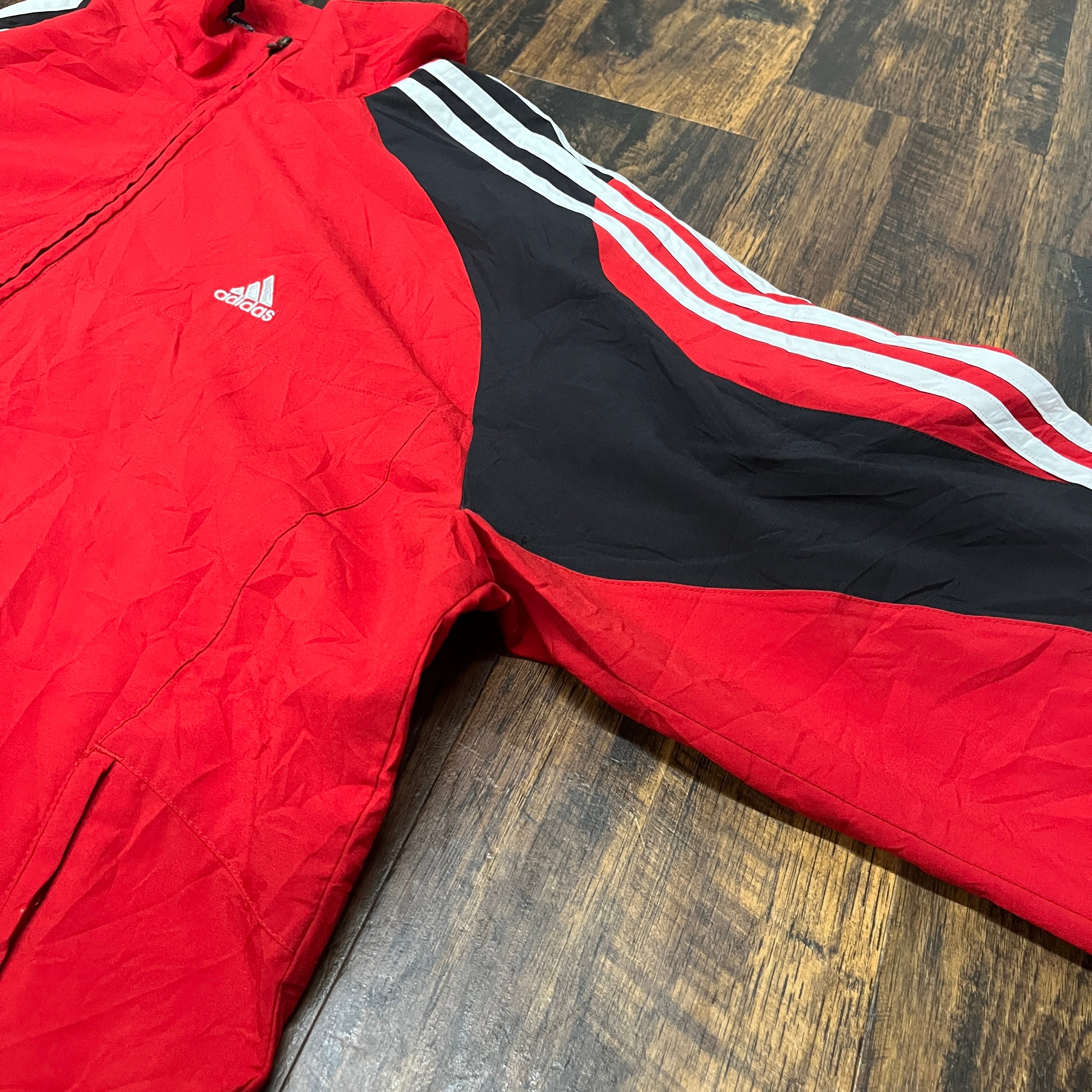 ナイロン製のレッドジップアップジャケット、ストライプデザイン。