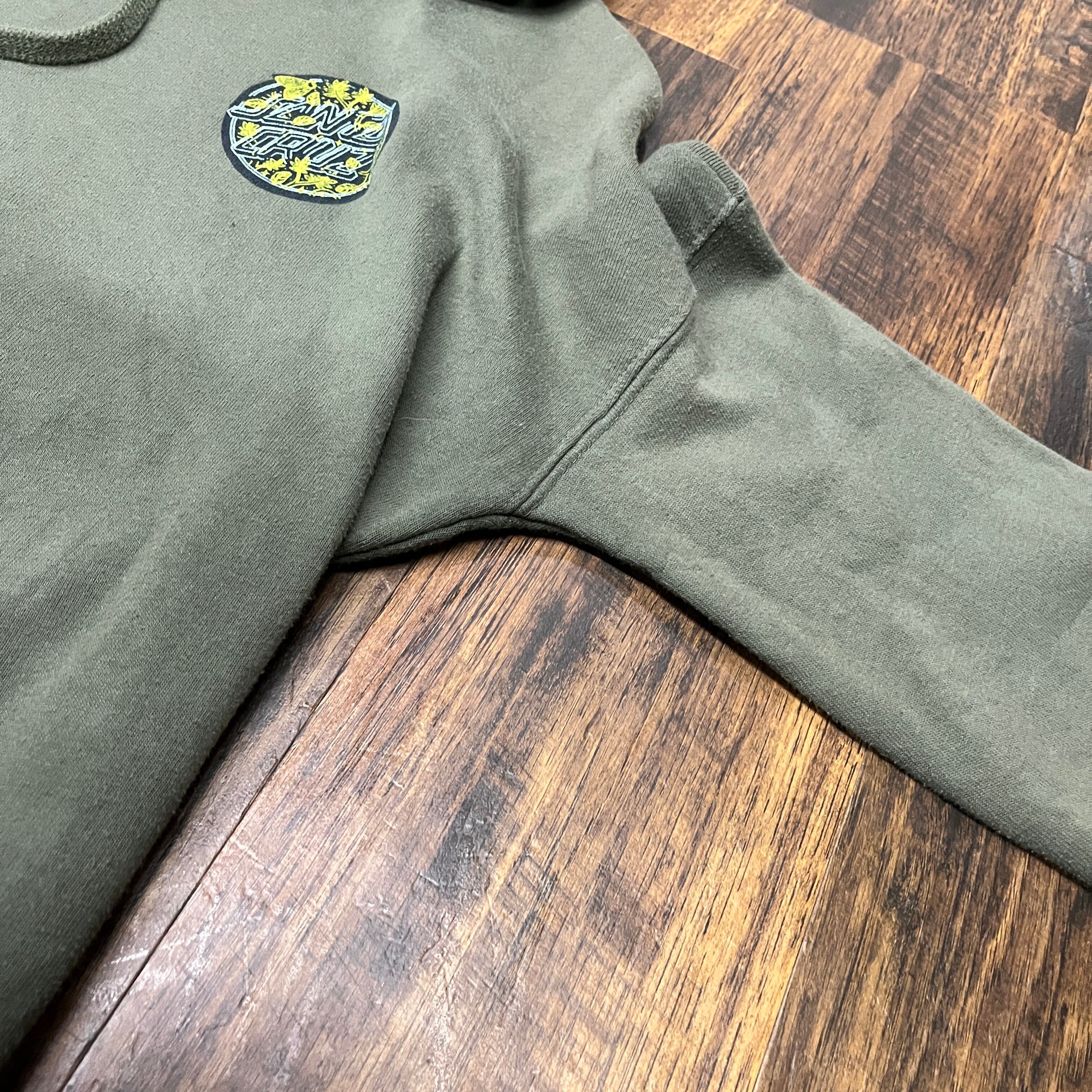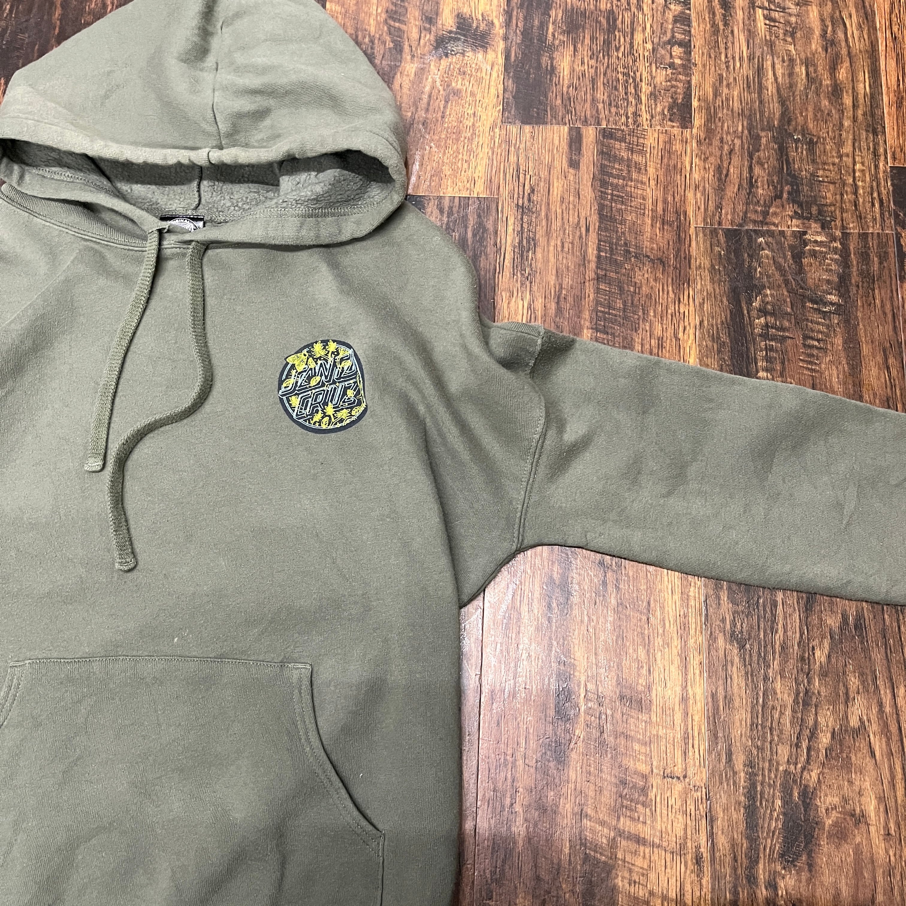 オリーブグリーンのフード付きパーカー、カラフルなロゴ刺繍付き。