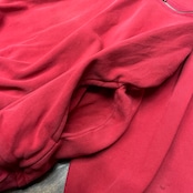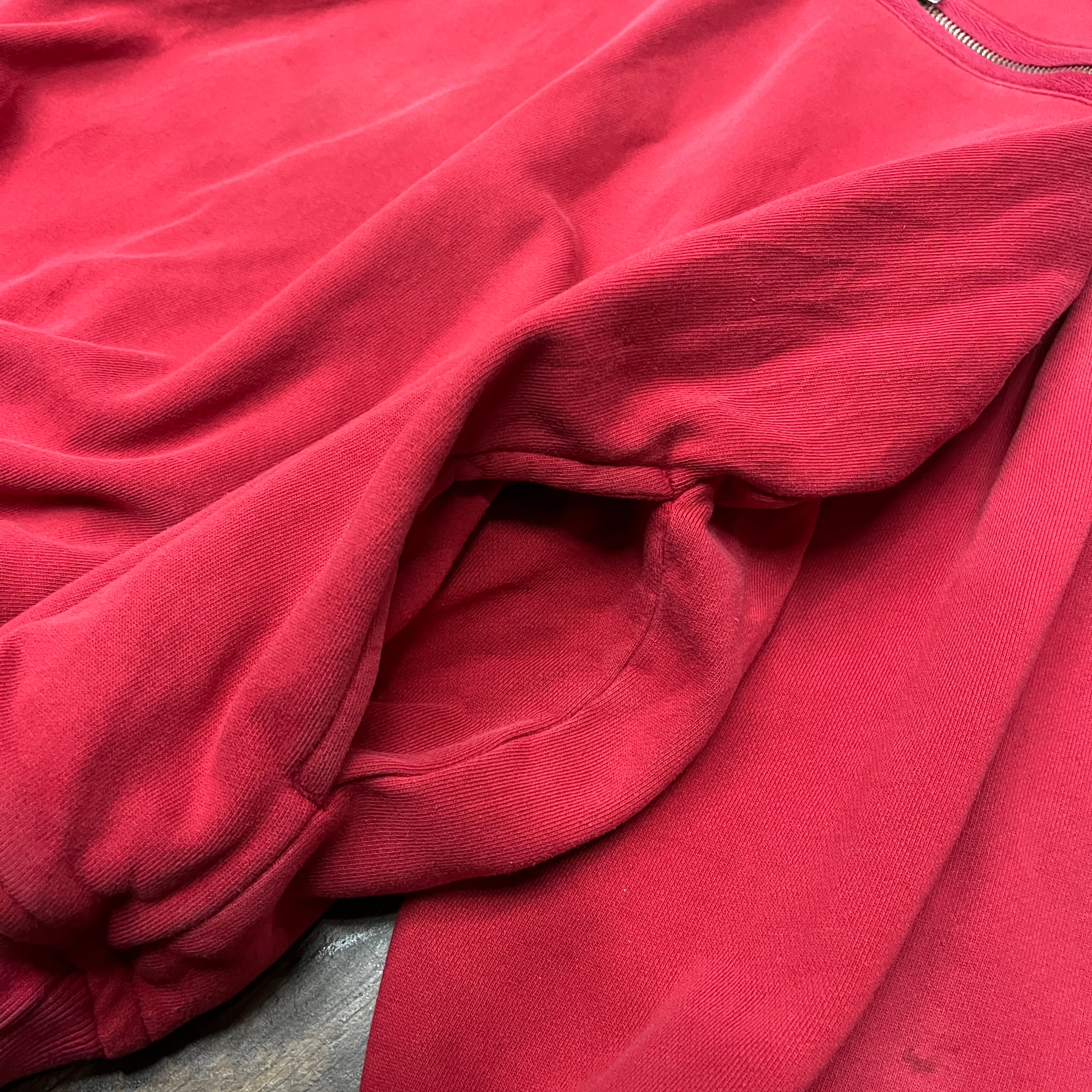 ハーフジップの赤いトレーナー、胸ポケット付きでルーズフィットスタイル。