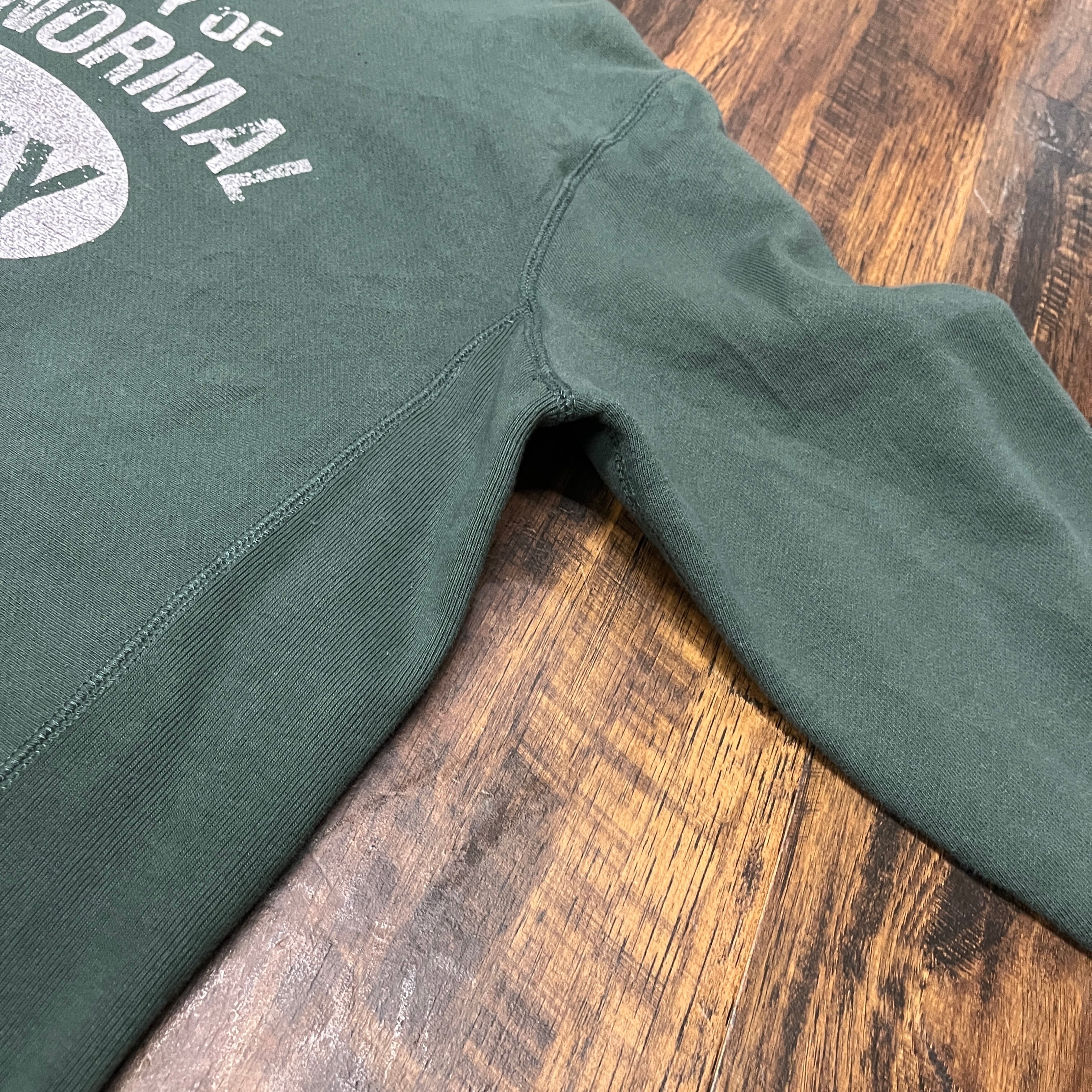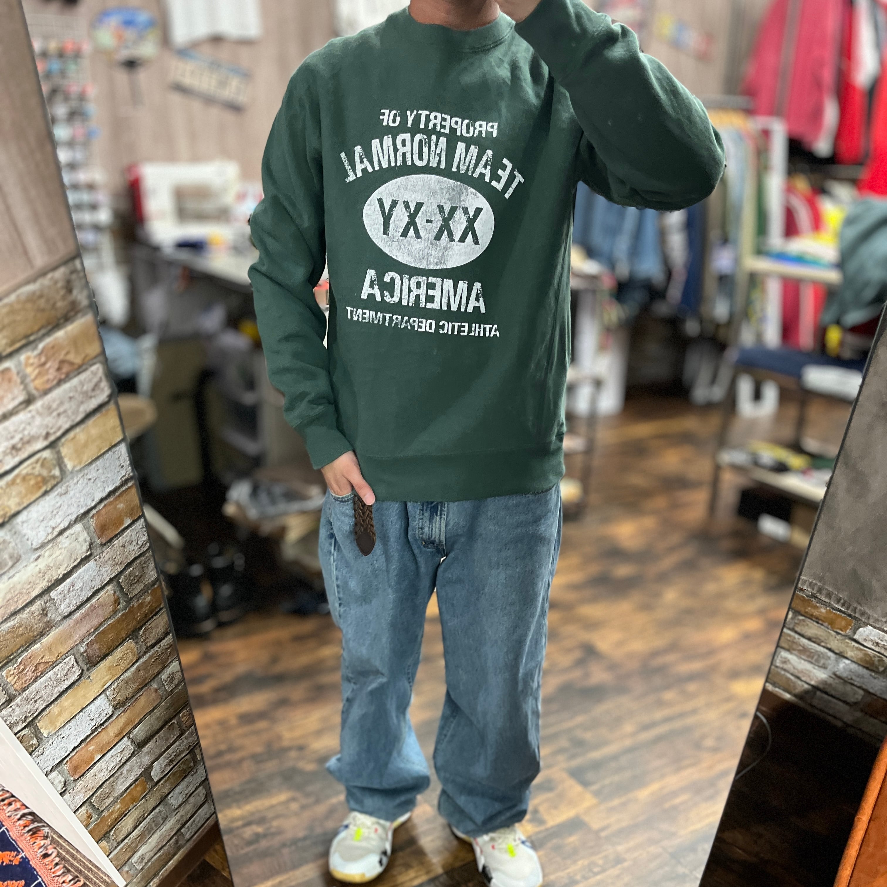 ダークグリーンのプリントスウェット、アメリカンスタイルのデザイン。