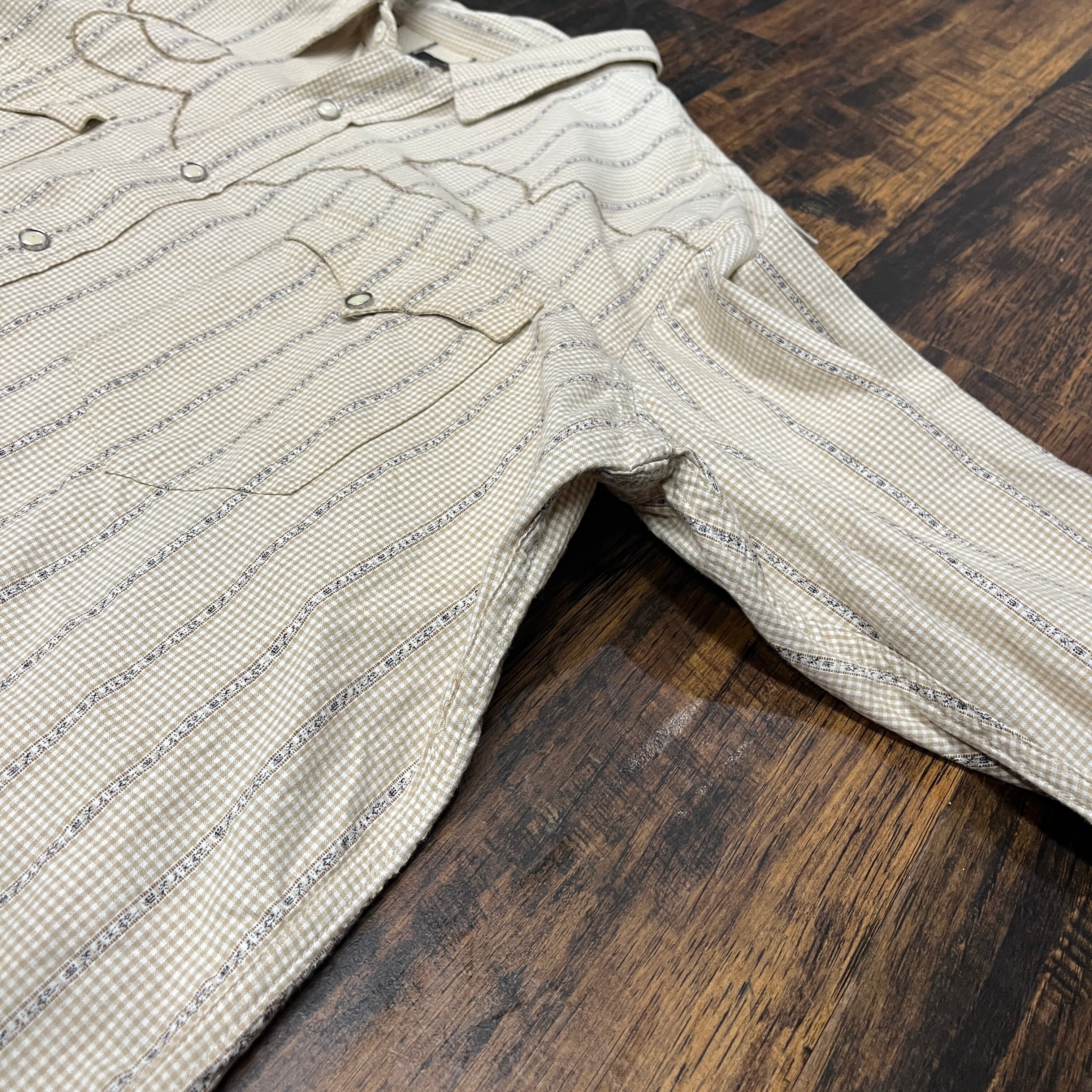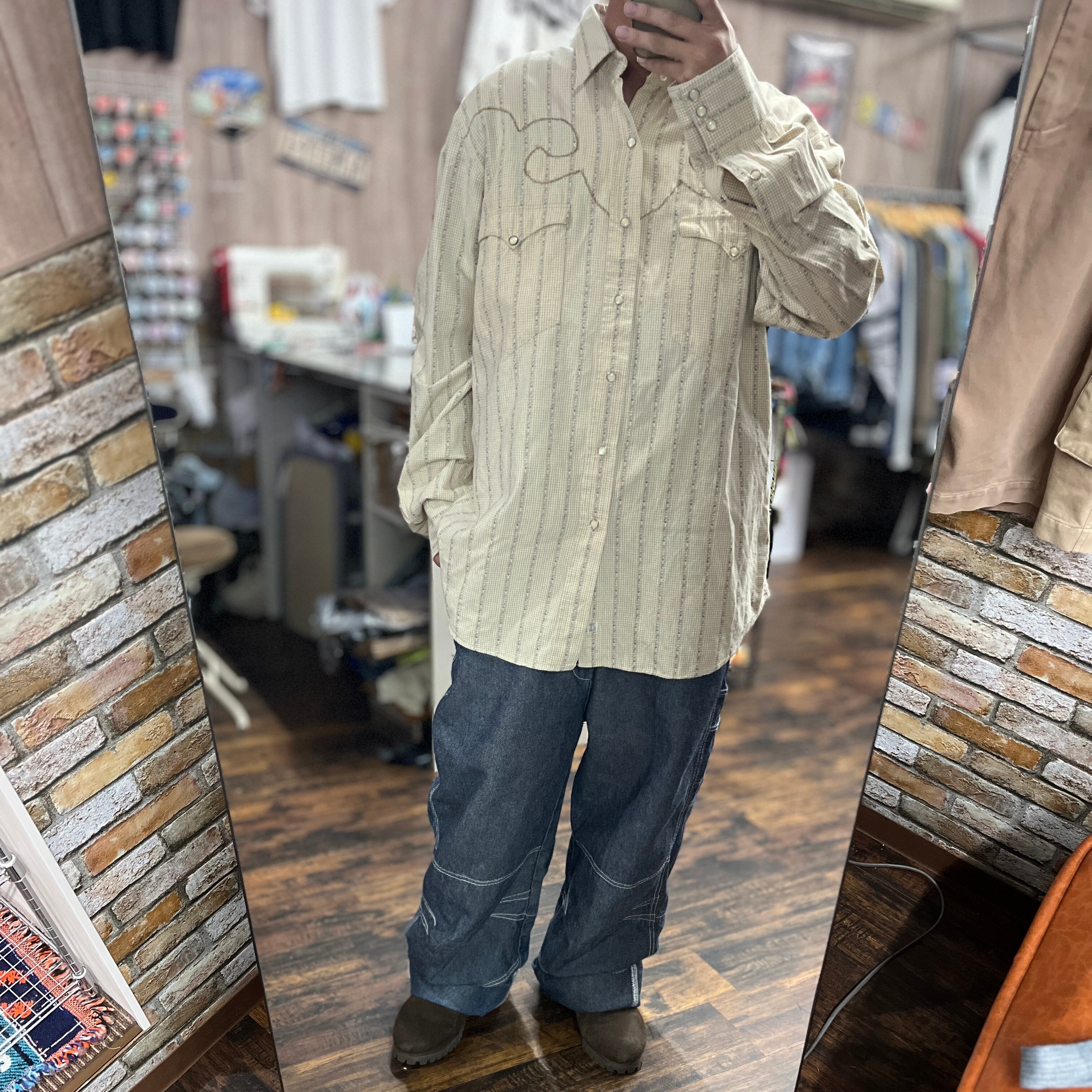 アイボリーのストライプウエスタンシャツ、刺繍付きポケットが特徴。
