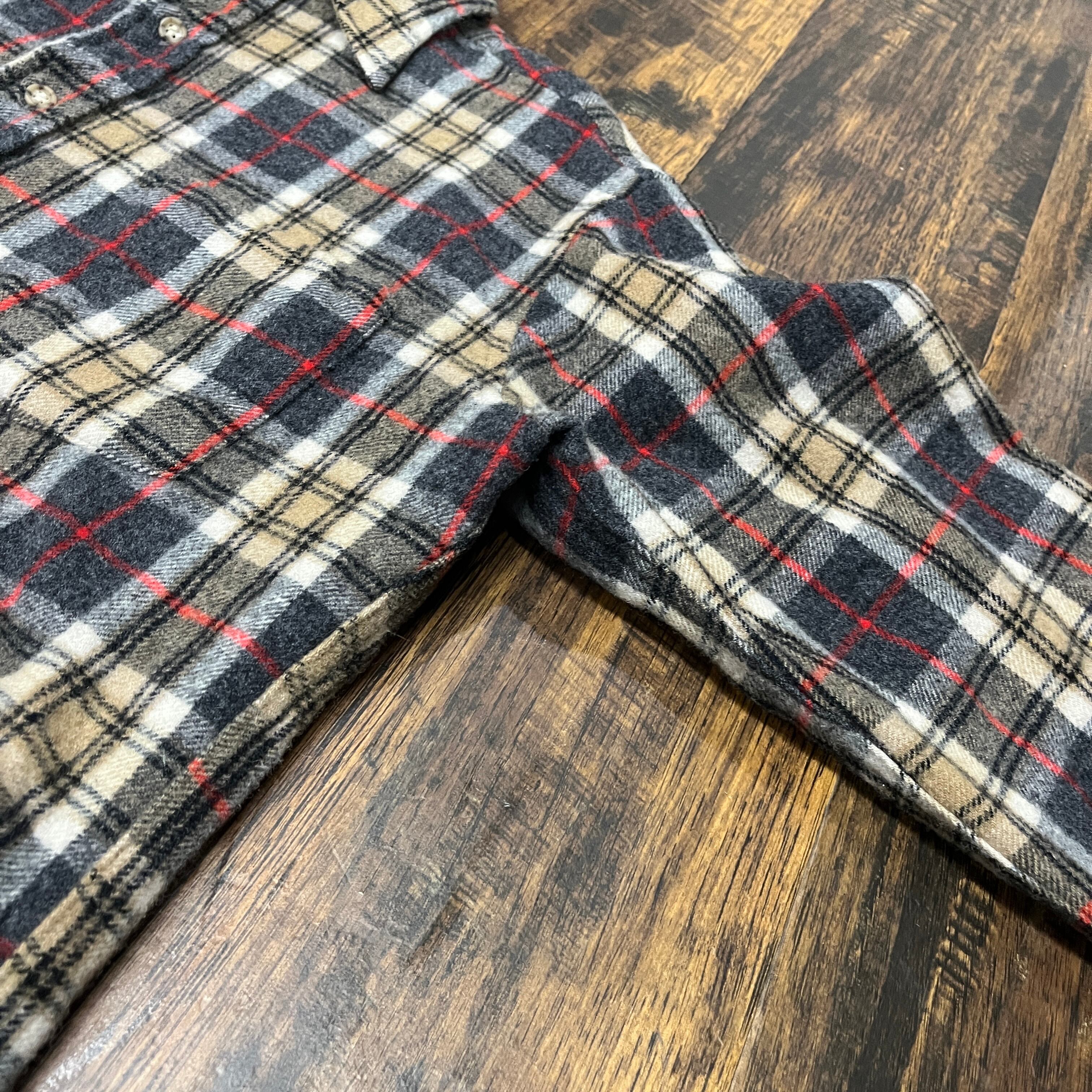 赤、黒、ベージュのチェック柄フランネル長袖シャツ。