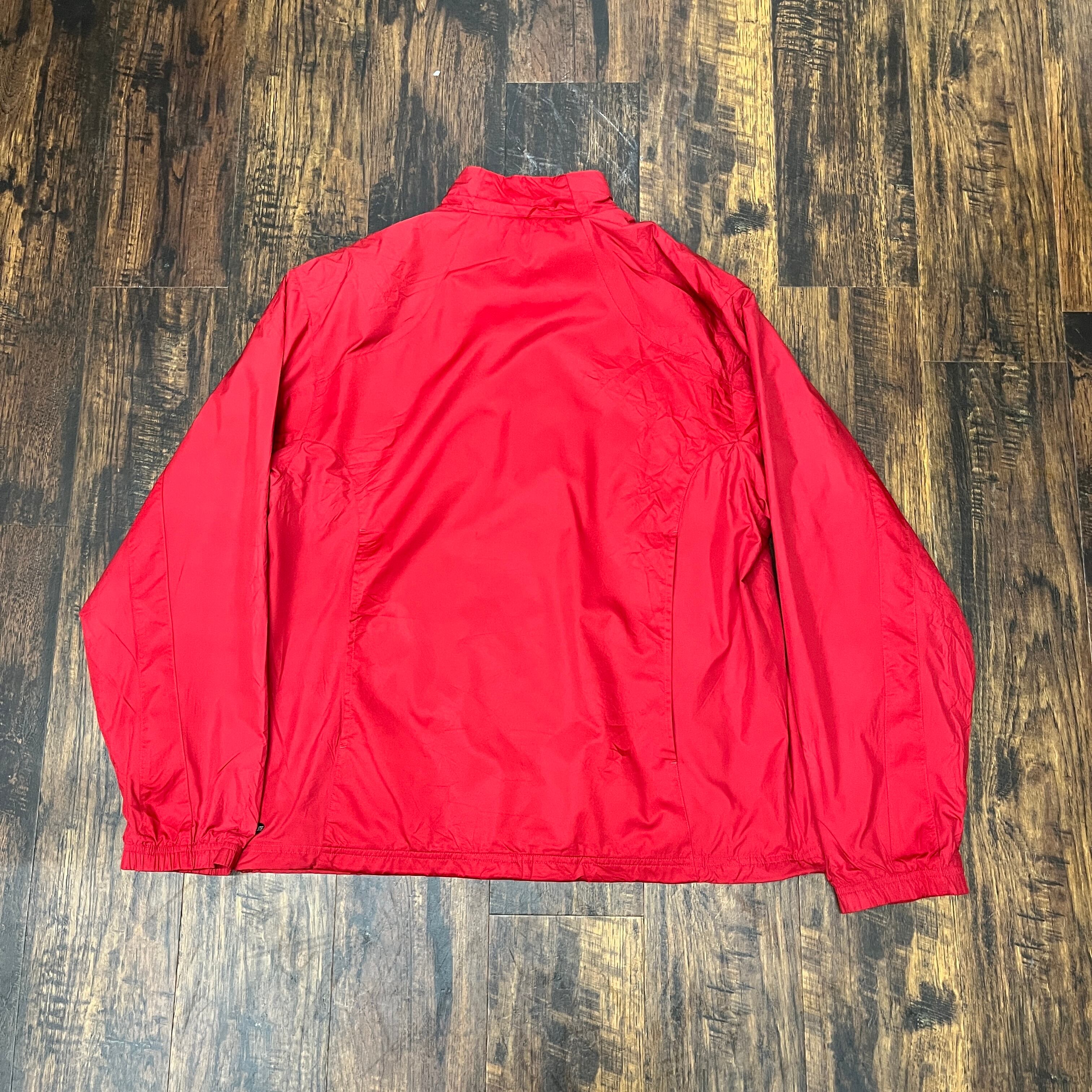 adidasのレッドナイロンジャケット、ストライプデザインでスタイリッシュ。