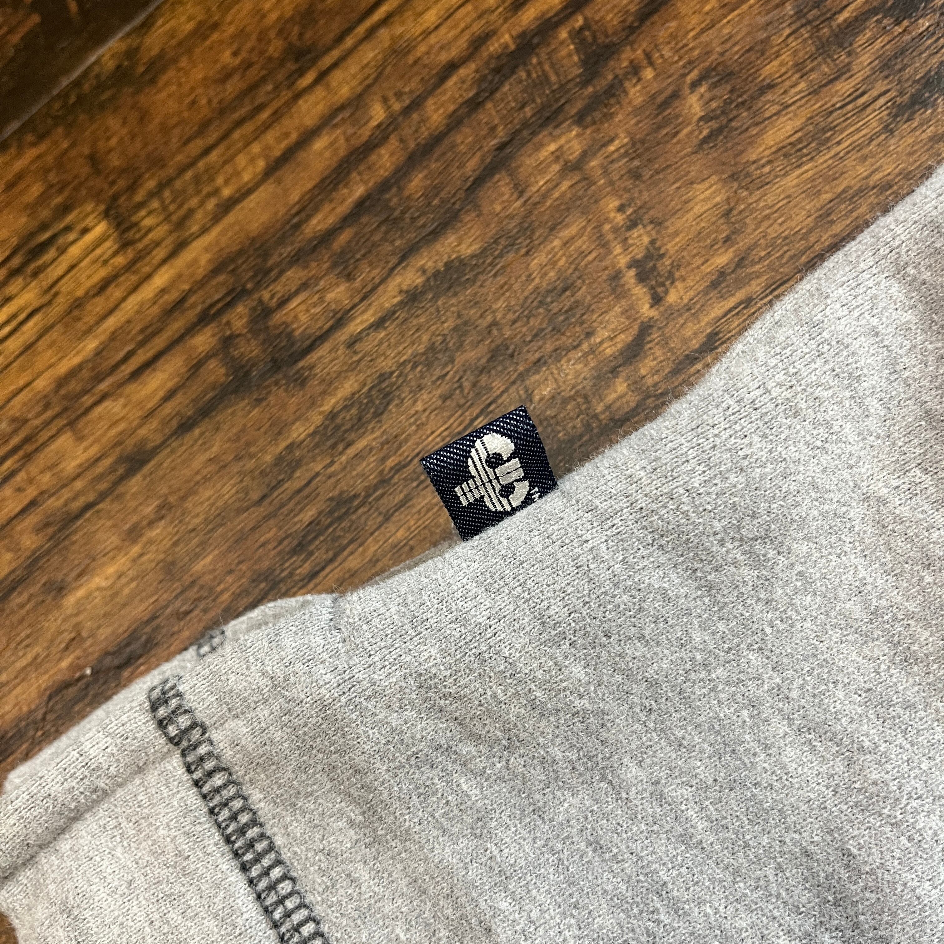 グレーとネイビーのVネックスウェット、1978年デザインのプリント入り。